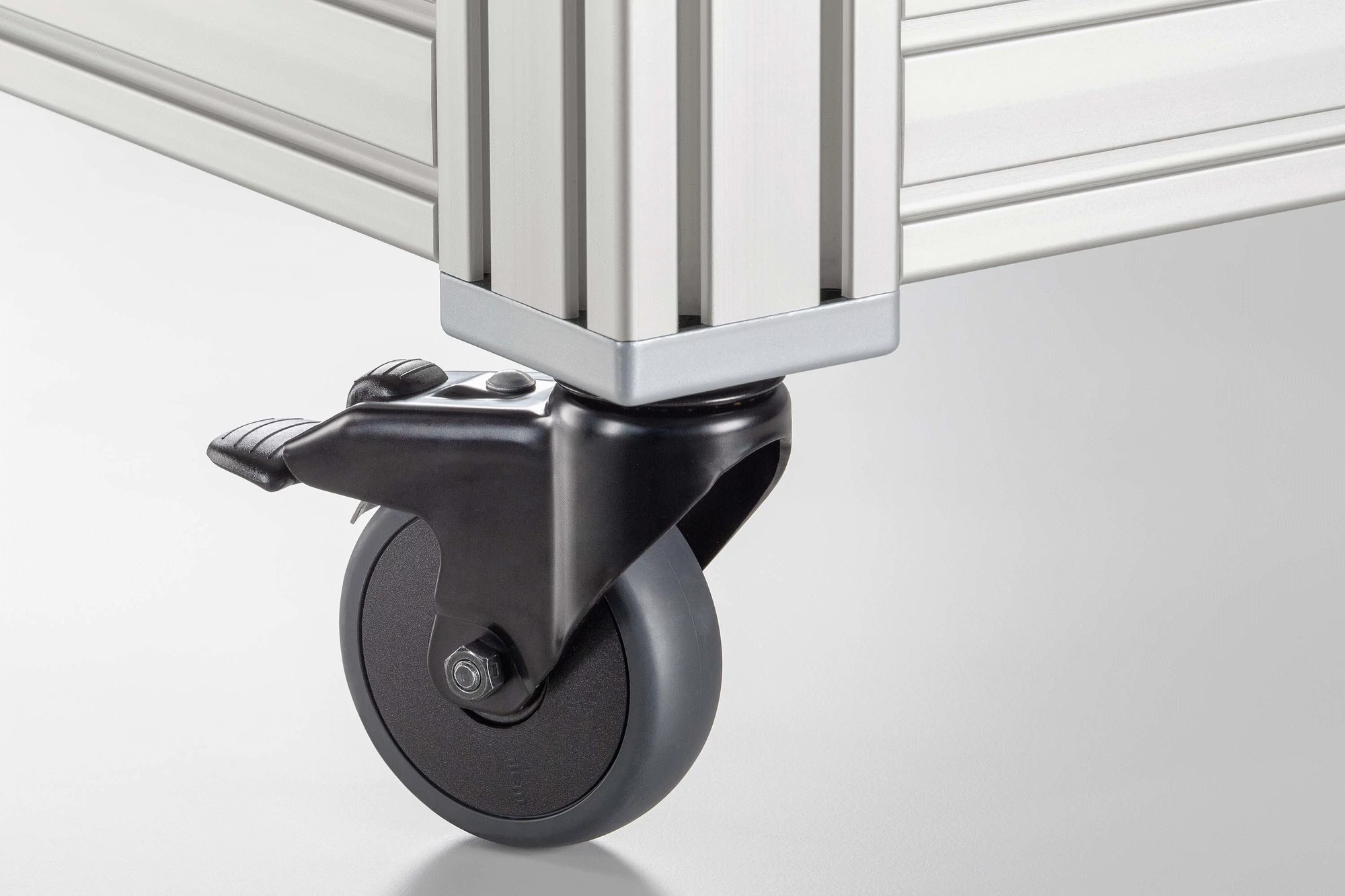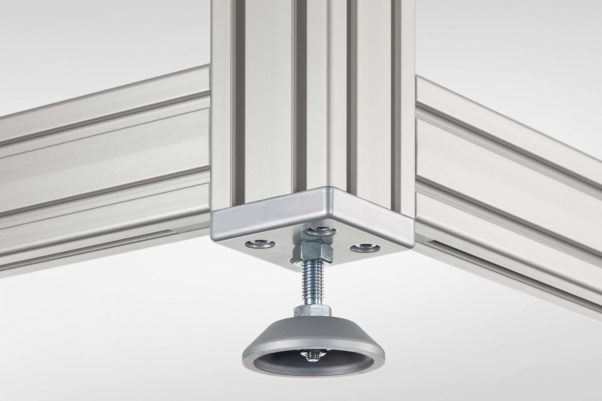 Secure connection! Base Plate 8 80x40 and Base Plate 8 80x80 are screwed into the core bores of profiles at the end face. The threaded hole in the centre accommodates castors and feet. They are available with an M10, M12 or M16 thread. The 16mm-thick plates made of die-cast zinc have a white aluminium powder coating, blending in perfectly with the overall look of a construction. Note: Base Plates for various profile sizes, with different thread dimensions and in the colours of black and white aluminium can be found in the item Online Shop.