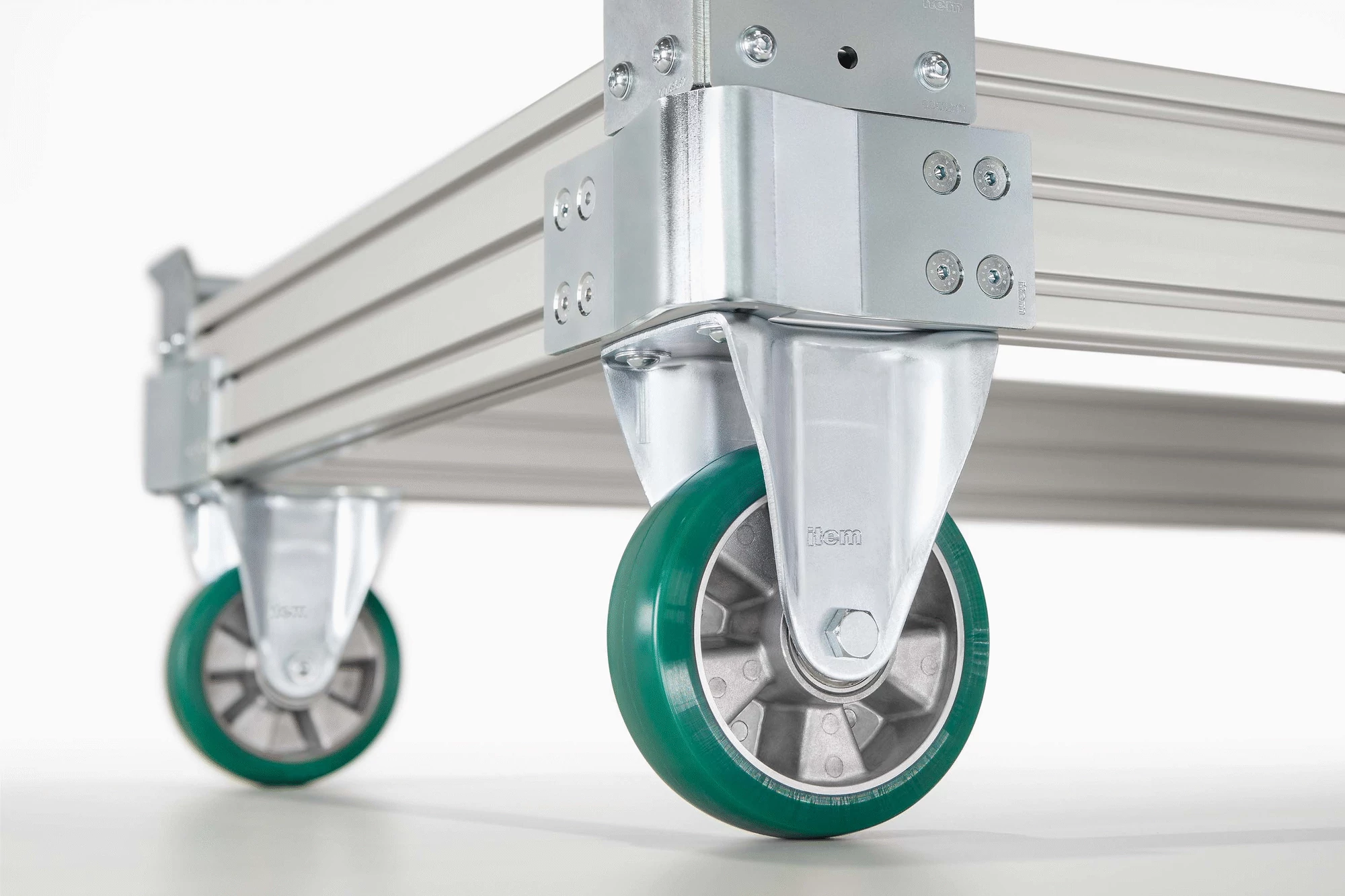 Casing, St, bright zinc-plated Wheel axle with ball bearing Wheel body, Al Tyre, PU, 75 Sh A, green Load-carrying capacity 550 kg/Castor at max. 4 km/h Load-carrying capacity 280 kg/Castor at max. 6 km/h Load-carrying capacity 200 kg/Castor at max. 10 km/h Load-carrying capacity 450 kg/Castor at max. 16 km/h not including travelling over obstacles