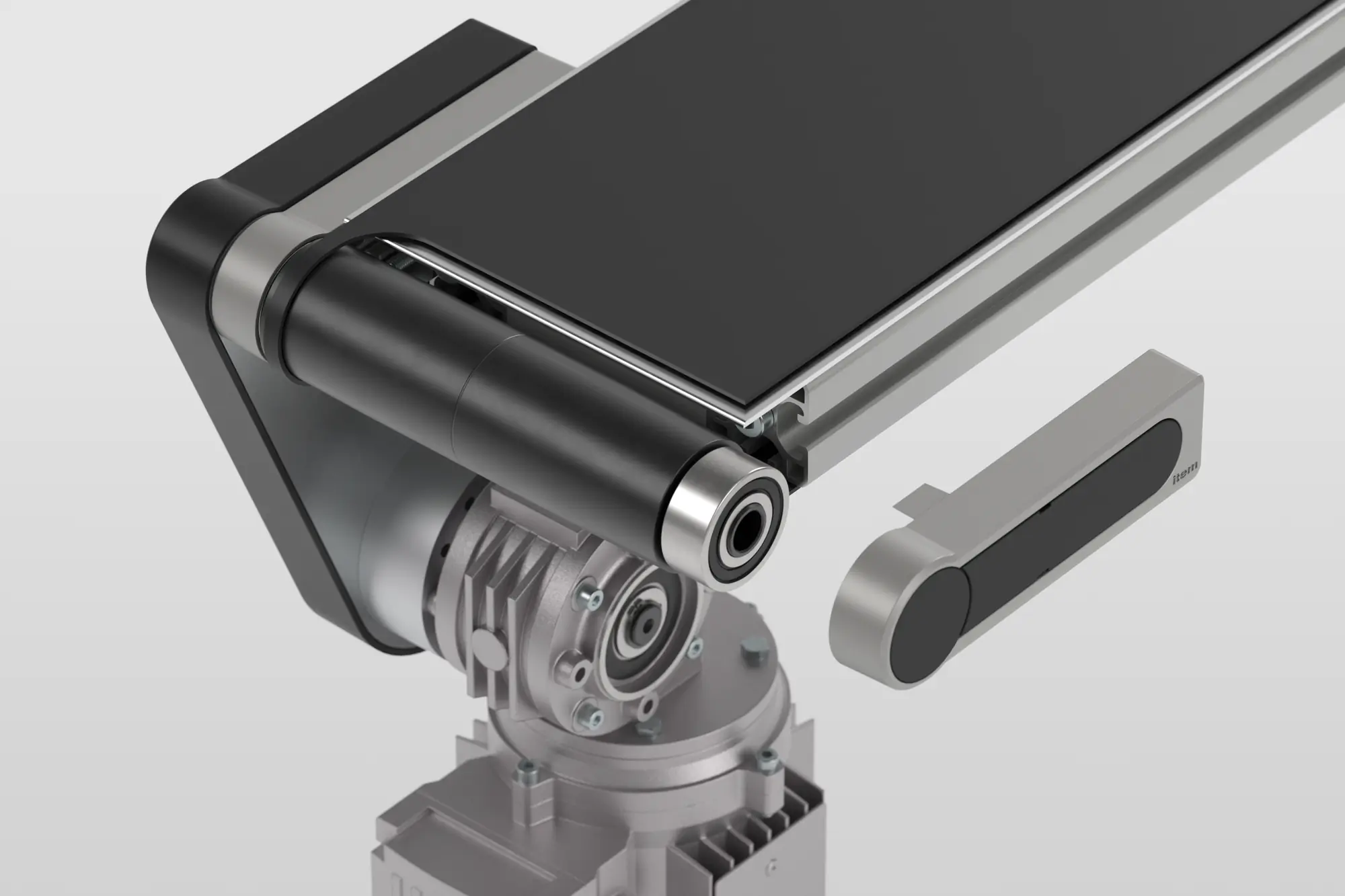 Drive Pulley, Flat Belt Conveyor 8 40 I -160 helps ensure belt conveyors run smoothly and evenly with the item indirect drive. Two-row self-aligning ball bearings compensate for potential axial misalignment. The recommended flat conveyor belt width is 150 mm. The pulley features a drive shaft for connection to the sprocket wheel in the motor fastening set for the indirect drive. A blind hole on the other side can be used to connect to Synchronising Set 8 40 (0.0.703.07).
