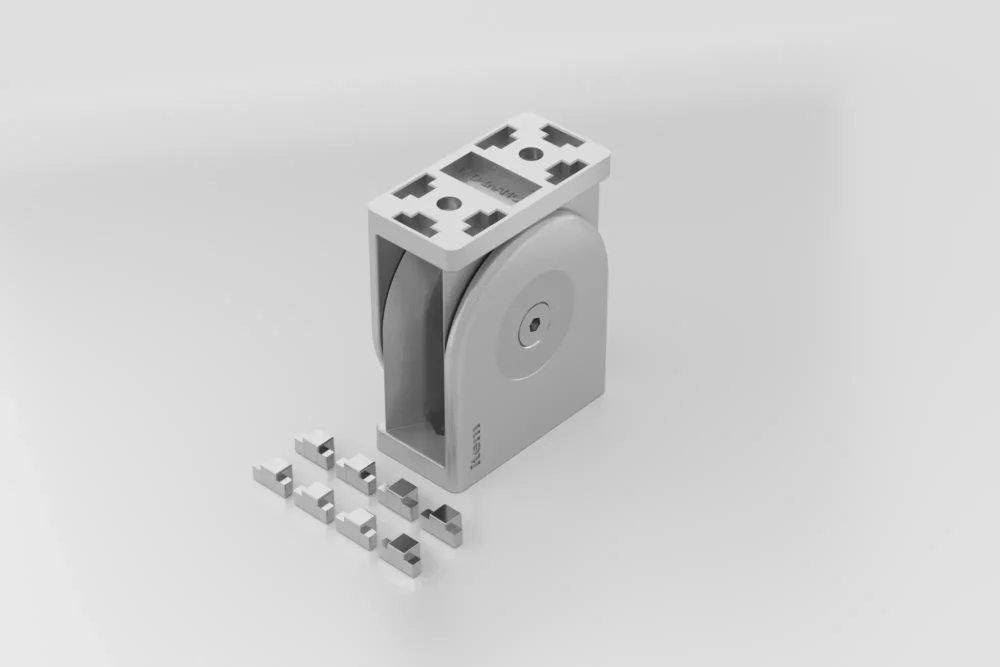The Hinge connects profiles at any angle up to 180°. The connection is made on the face side or with the matching t-slot nut.