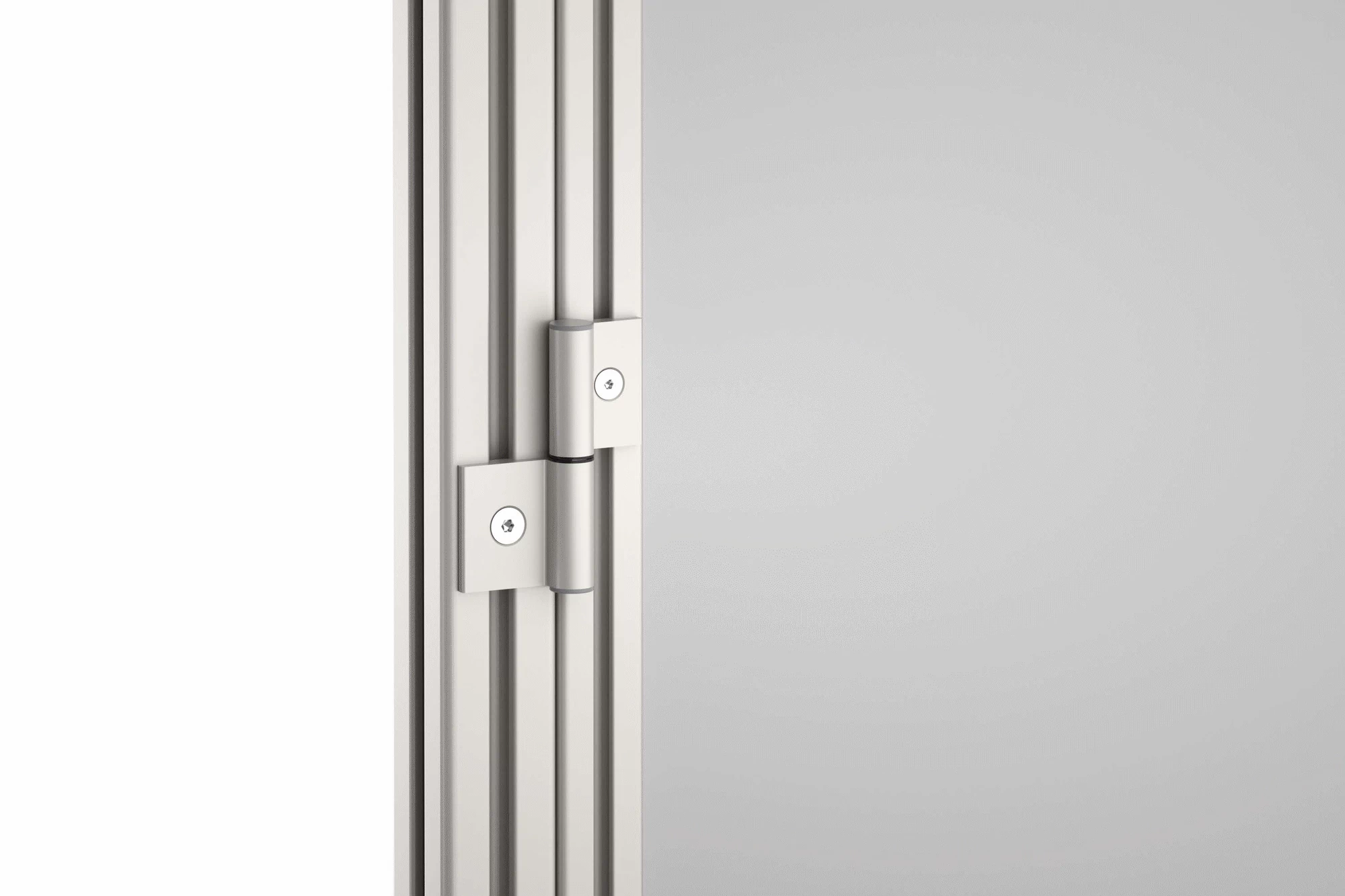 Hinges Al, light duty are available as complete sets for all popular combinations of profiles and for combinations of profiles and panel elements. Each of the sets consists of 2 Hinge Leaves and the Hinge Pin and the fastening elements (screws and T-Slot Nuts) for the relevant profile lines. The Hinge Pin is supplied with the relevant hinges. It is pressed into one of the Hinge Leaves. Right-hand or left-hand hinges are possible by inserting the pin into the Hinge Leaf in the appropriate direction.