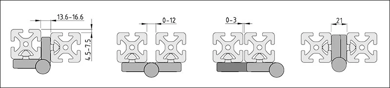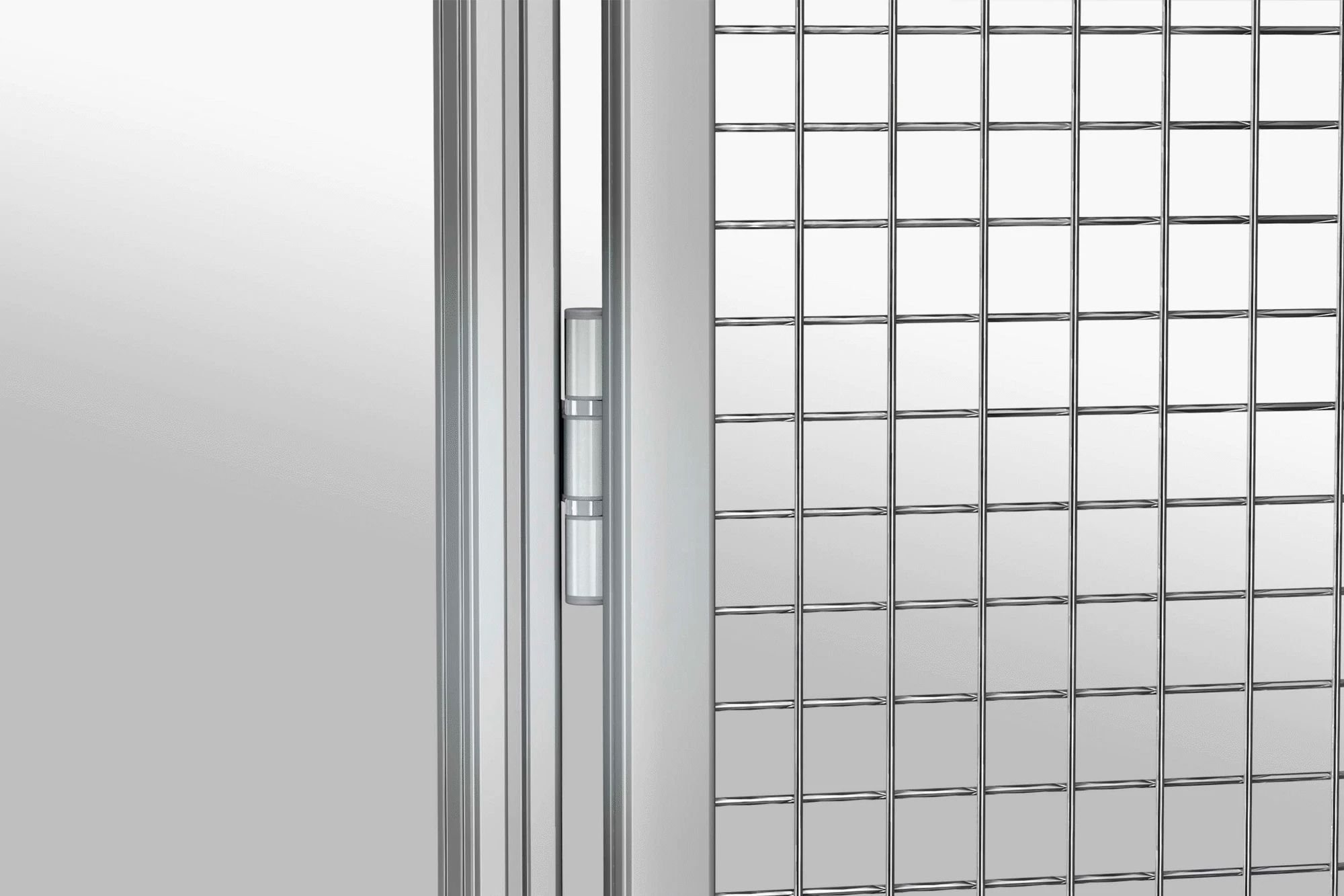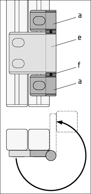 Example of a hinge opening around 270°. The combination of Hinge Leaf 8 80x80 and two Hinge Leaves 8 40x40 (using a Hinge Pin D8x116) can be used to construct a hinge with a 270° angle of swing. This may be required, first and foremost, when constructing wide-opening doors in machine panelling.