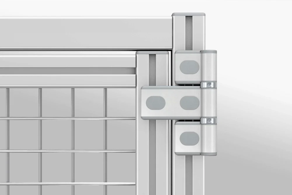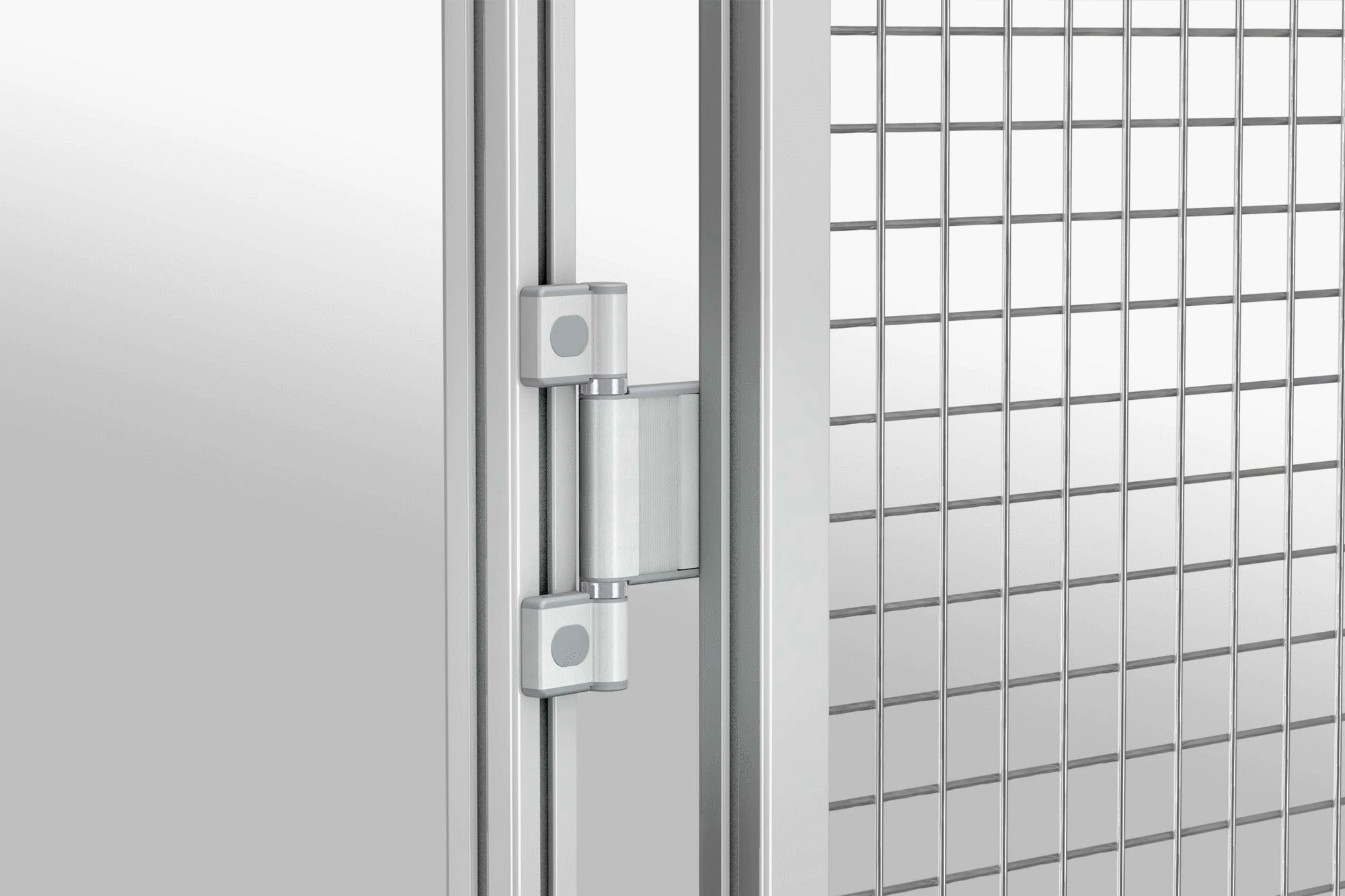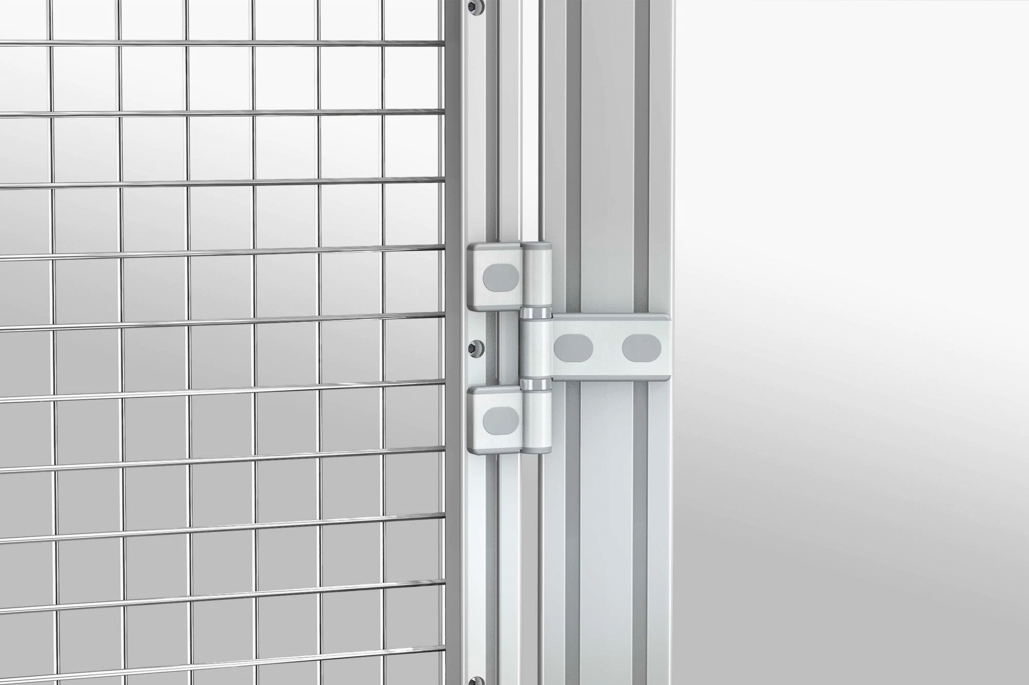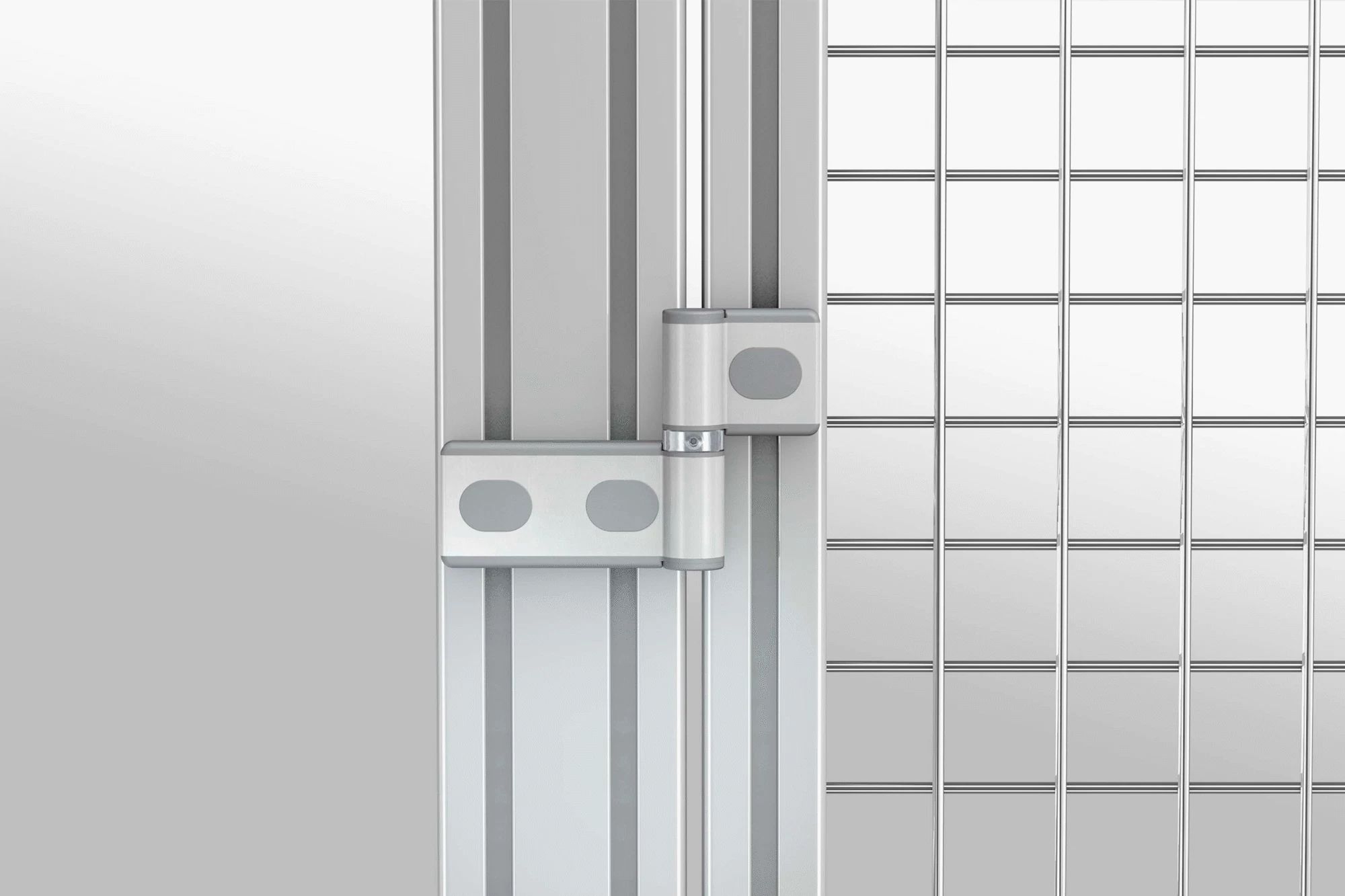 Modular Hinge System for high-strength aluminium hinges. Suitable for heavy doors, lids and swivel-type devices. Hinge Leaves of various heights and widths support heavy-duty hinges of virtually any length which the user can adapt to the specific situation. Hinges with an opening angle of up to 270° can be achieved using a suitable combination of sets. A hinge consists of at least two Hinge Leaves and a suitable Hinge Pin. The Hinge Leaves and Pin are available in different lengths. When selecting these components, the minimum depth which the pin is inserted into the eye of the Hinge Leaf must always be taken into account. Defined sets always contain all components necessary for a complete Hinge Leaf or Hinge Pin. The use of slots and stepped locating lugs for screwing the Hinge Leaves facilitates the process of aligning the doors in the surrounding door frame. The locating lugs also serve as an anti-torsion device in the groove, thus preventing the hinges from becoming displaced under load. Fastening is also possible to the end face of the profile. The slots are sealed with the enclosed Caps after installation has been completed, as are the drill holes of the hinge eyes.