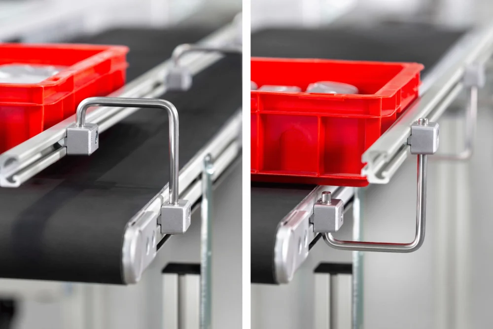 Thanks to the broad pivot range of Brackets J D8 and custom orientation options, the gap between the railing and the conveyor line can be adapted to suit requirements. This means that guide rails can be positioned outside or inside the conveyor section and disordered goods can be gathered together as they travel along the conveyor. The railing can be fitted with a slide strip to protect transported goods and to smooth out the transition between two sections of Profile 8 24x20 D30.