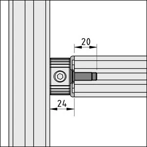 To use Click-Fastening Set 8 90°, the core bore of the Profile 8 connected via the end face must have an M8x20 tapped hole. In this case, the distance between the end face of the profile and the side of the second profile is 24 mm.