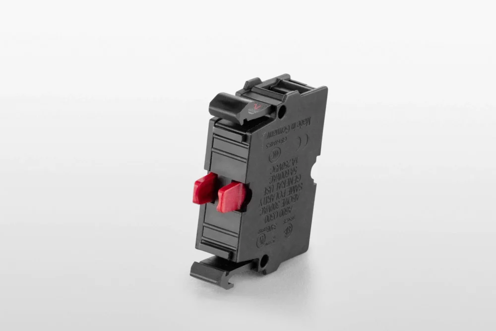 Compact Contact Blocks for triggering operating elements are clipped into Mounting Clamp for Contact Blocks, 22mm (0.0.691.55) in a space-saving solution. Two Blocks can be installed to enable alternating switching. Contact Block, 1NC, 22mm and Contact Block, 1NO, 22mm are available to choose from. Emergency Stop Buttons, Selector Switches and Pushbuttons are available from item to initiate functions.