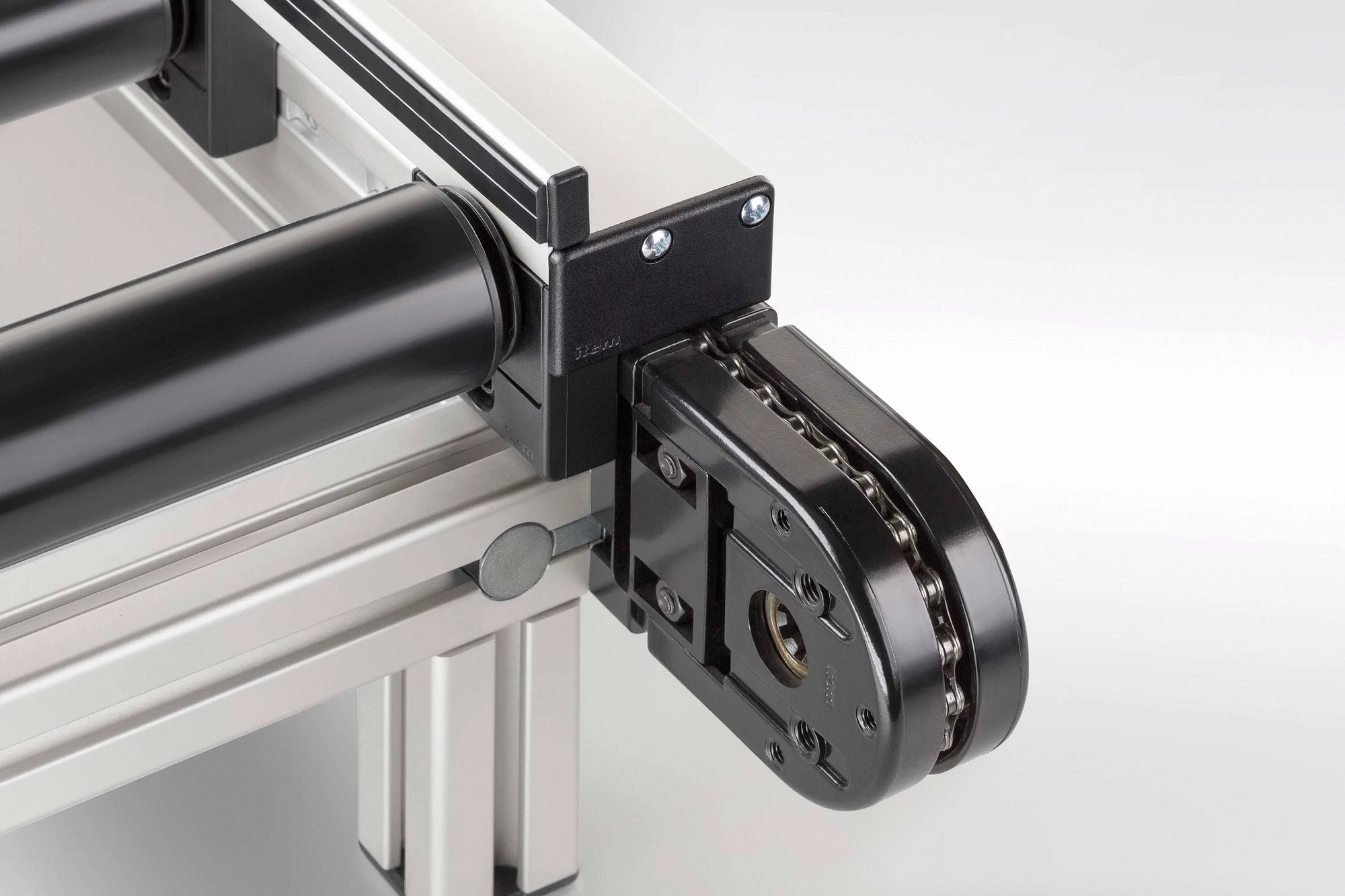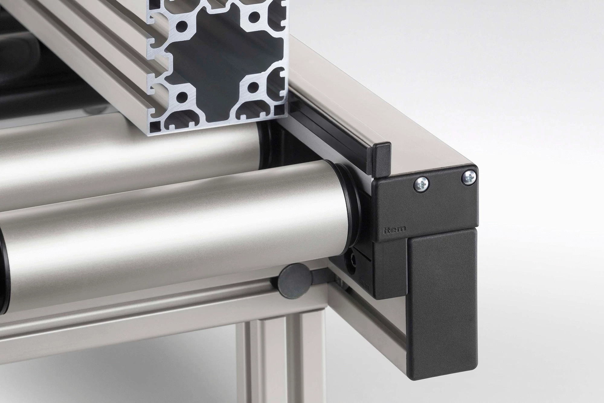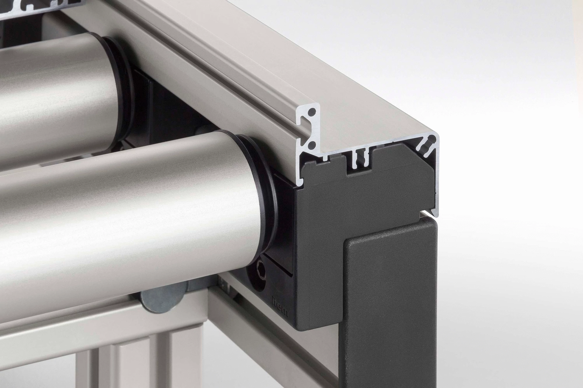 After fitting, the bearing blocks are covered by the Housing Profile, which stretches along the entire length of the roller conveyor. The design of the Housing Profile with Side Guide ensures that transported goods are kept on track and the side guide itself incorporates a Line 5 groove that enables users to attach a Slide Strip 5 or other guide element.
