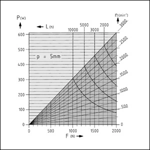 Pitch p = 5 mm Stroke velocity max. = 0.25 m/s Efficiency of overall unit = 80 % Backlash max.(spindle/drive nut) = 0.04 mm m = 5 kg + H x 0.011 kg/mm