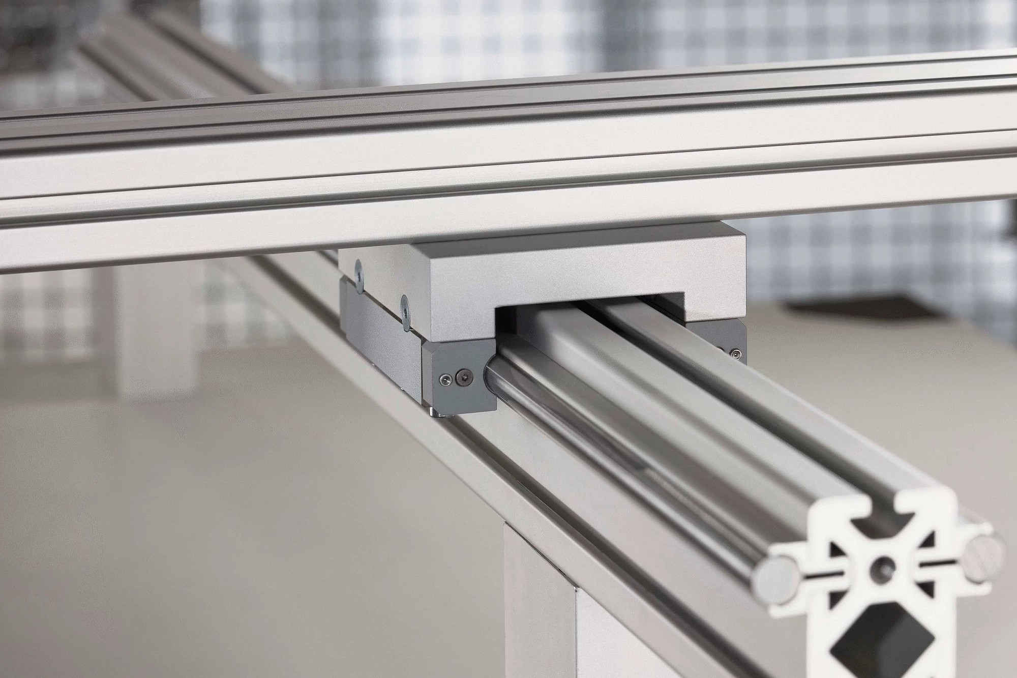Looking for a linear slide that is more rigid and compact than roller guides but just as modular and easy to fit to standard profiles? The linear guide units from item are exactly what you need! Complete carriages for profile widths of 40 and 80 mm that are mounted on shafts in Shaft-Clamp Profiles. Other benefits of these guide elements include ease of assembly, lower moving mass and simple adjustability. Guiding shafts D14 can be fitted to Profiles 8 (not the light or E variants) in widths of 40 or 80 mm. Maximum guide length: 6,000 mm. The guide is particularly suitable for tensile and compressive loads on the carriage plate .