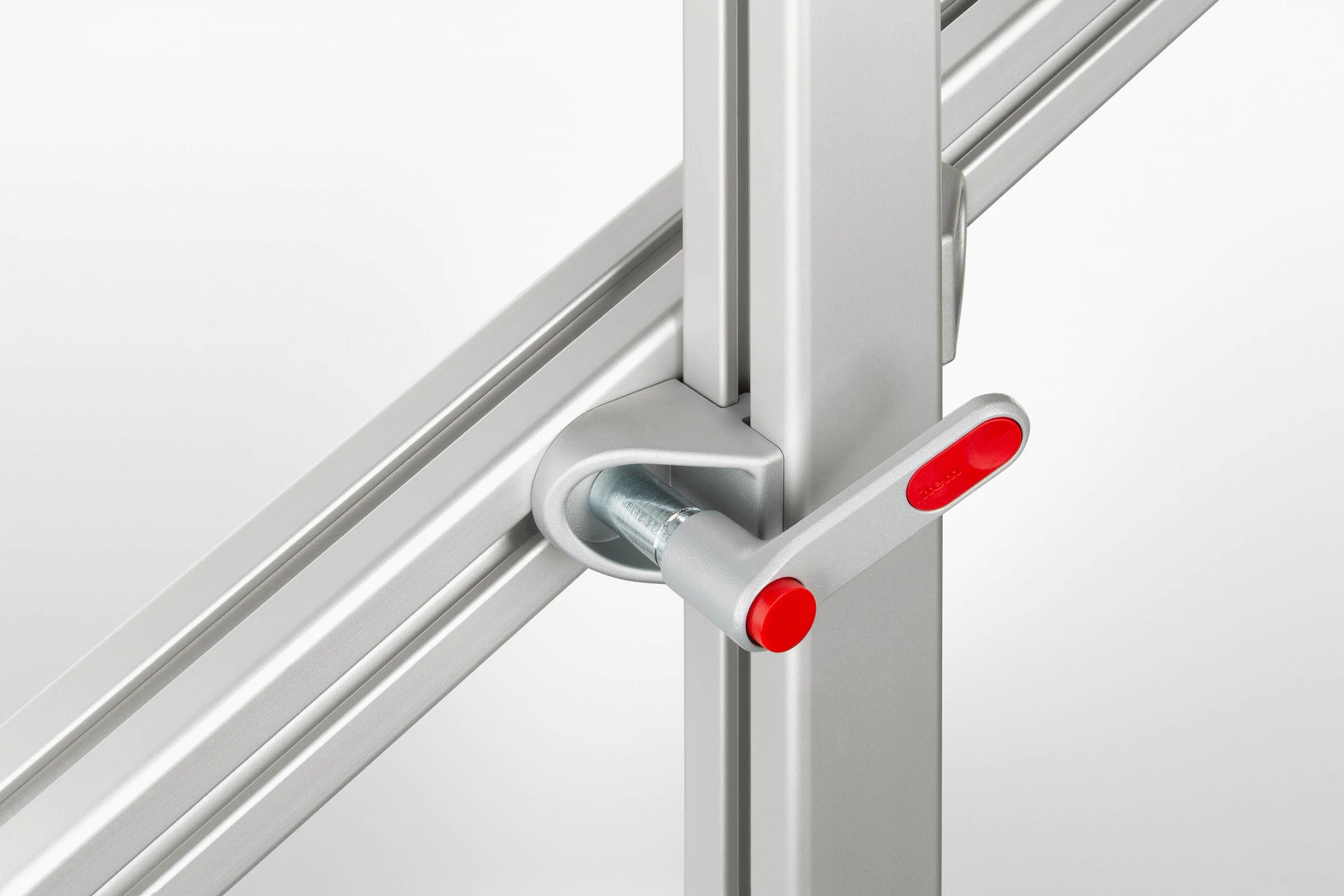 The Angle Clamp Bracket can be used in combination with an Angle Hinge Bracket or a second Angle Clamp Bracket to provide a simple connection between two crossing profiles. Loosening the screw or clamp lever releases the tension in the two profile grooves and allows rotation at any angle and movement along the grooves.