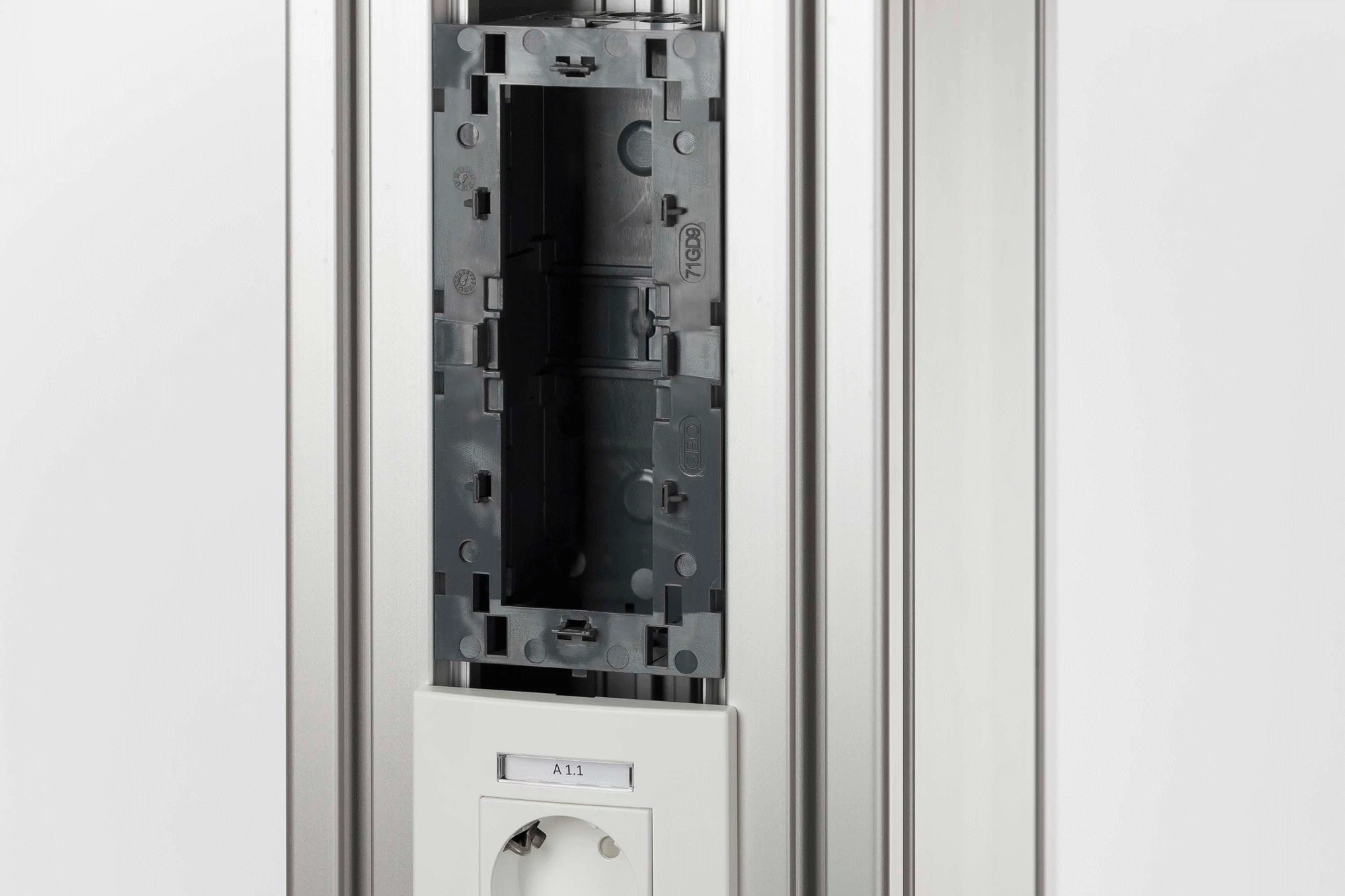 The universal solution for fitting M45 installation devices to the item installation profiles. The front-locking Mounting Box can be inserted at any point on the cable conduit. The lower part of the Mounting Box can be folded back and even removed so that cables can be connected quickly. The feed openings are designed to accommodate cables up to 14 mm in diameter. The Mounting Boxes have been designed to support the speedy installation of Sockets, Switches and connections based on the Modul 45 (M45) system.