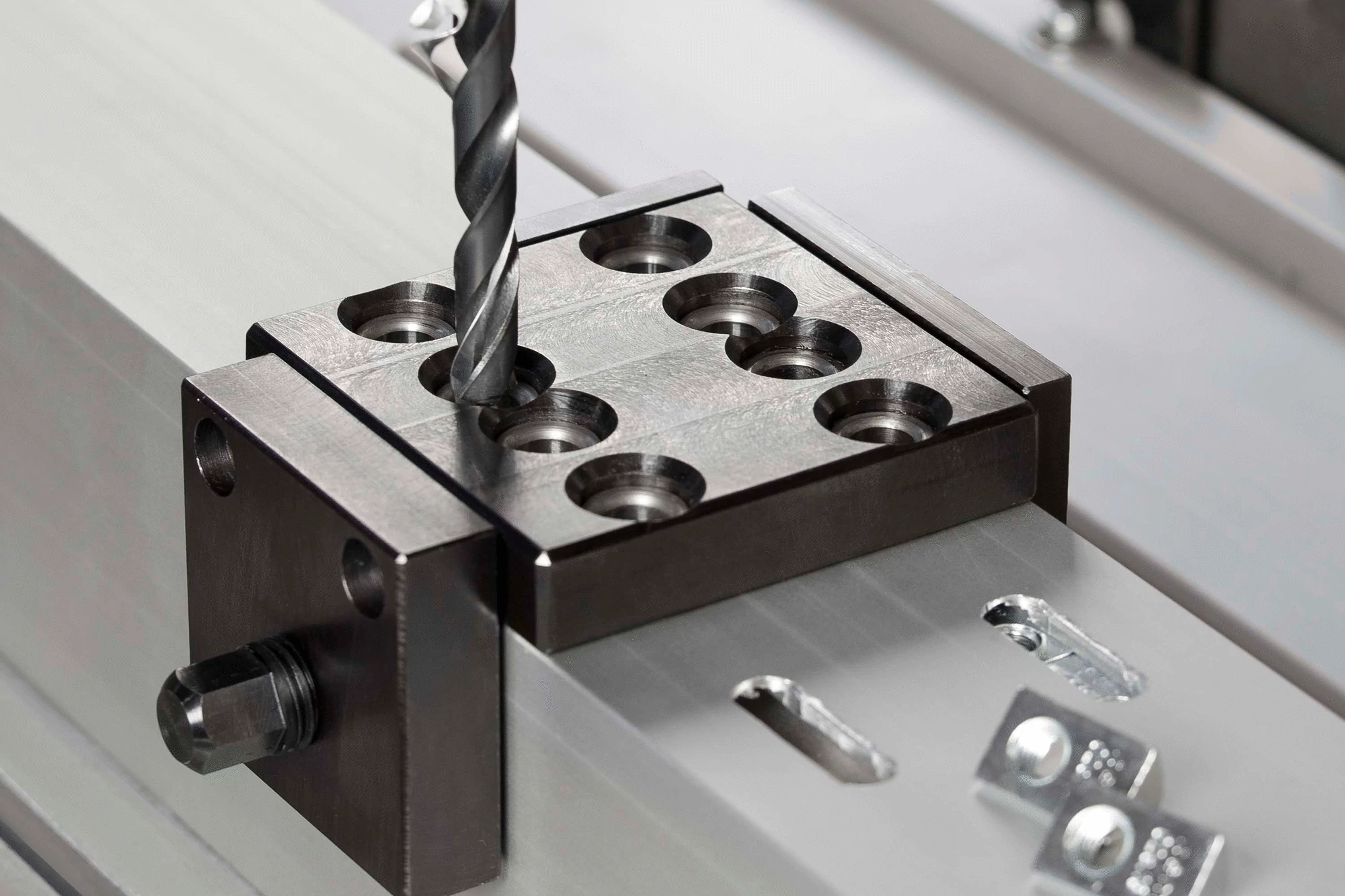 The task: Cutting holes or slots into the closed profile grooves of a Profile 8 or Profile X 8 – in precisely the right position and dimensions for deploying a T-Slot Nut 8 or other fastener. The solution: The Drilling Jig for opening up grooves, which is fastened to the outside of the profile and incorporates hardened drill bushes for high-precision drill guidance. Simple to use with reliable results!