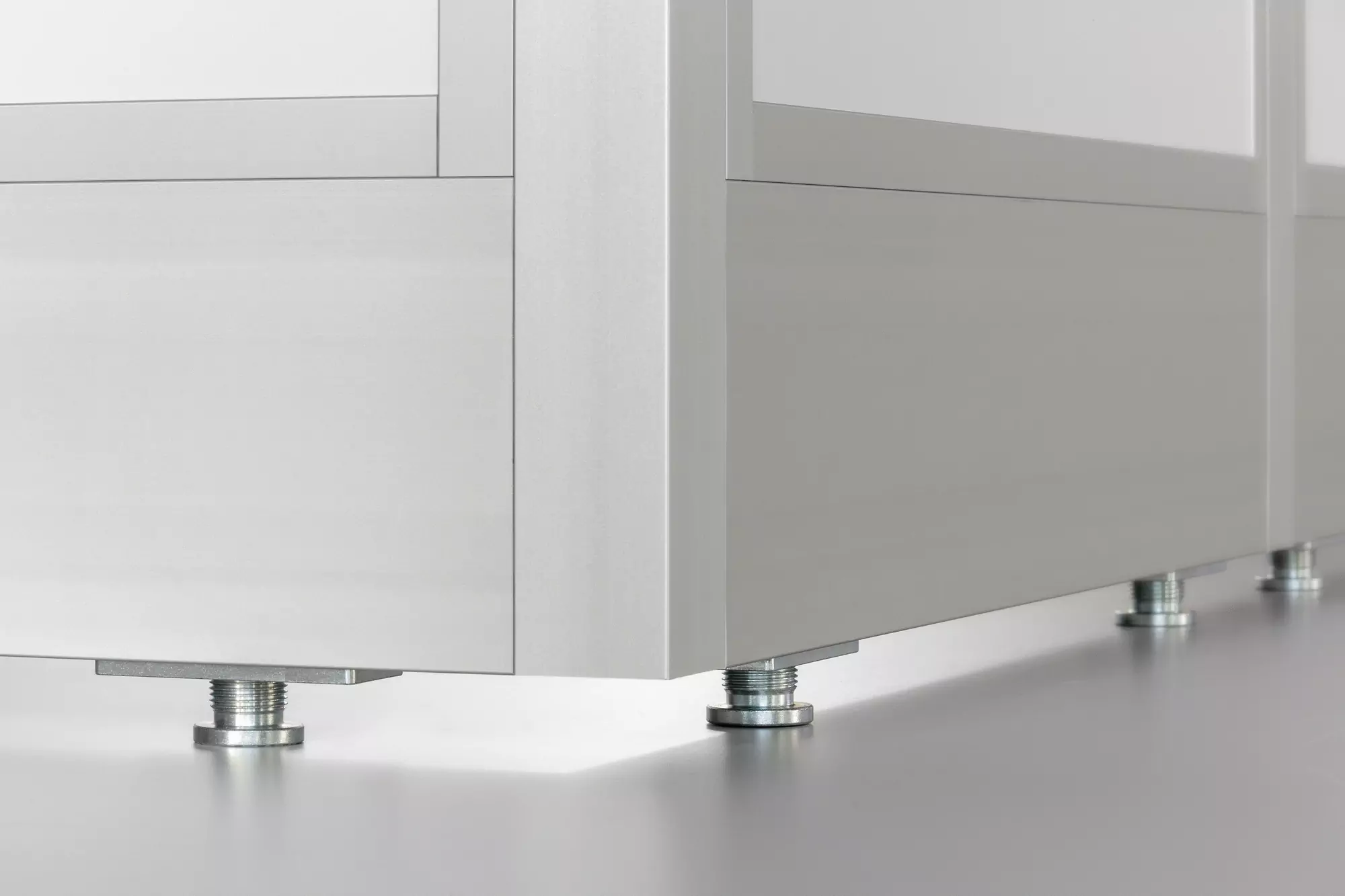 Installation sequence for Adjustable Foot 8 M20x40 when using profiles that are 80 mm wide: 1. Drill ⌀24 mm through hole (from both sides, if necessary) 2. Insert Adjustable Foot and fasten flange to two parallel grooves 3. Use hex key to level frame from above 4. Fit Screw Anchor as described above