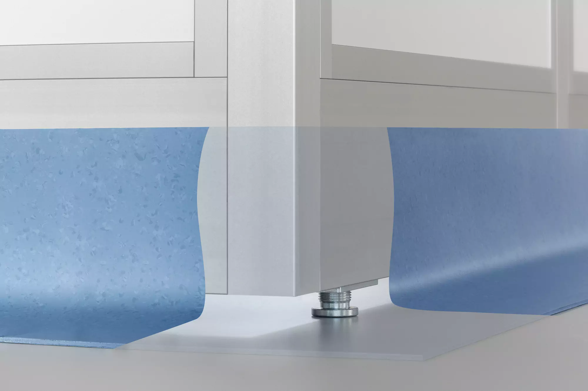 Installation sequence for Adjustable Foot 8 M20x40 and Screw Anchor when using profiles that are 40 mm wide: 1. Drill ⌀24 mm through hole (from both sides, if necessary) 2. Insert and fasten Adjustable Foot 3. Use hex key to level frame from above 4. Drill hole in floor and clear out hole 5. Introduce Screw Anchor from above and tighten securely in place