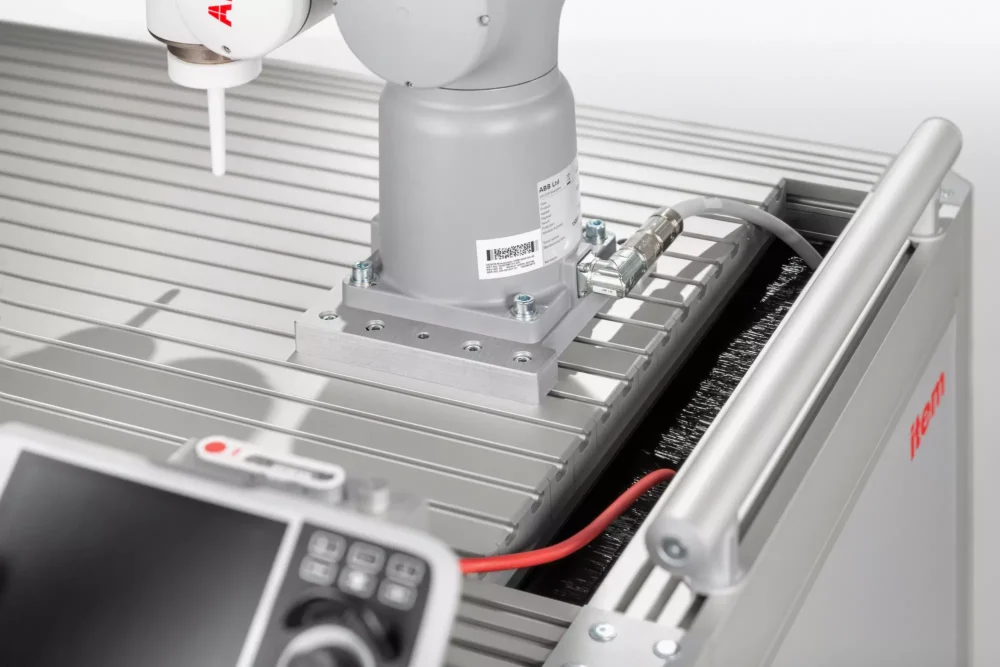 Robot Mounting Plate 8 240x200 helps with securely fastening cobots from ABB to profiles and frames that have a Line 8 groove. Made of high-strength aluminium, the plates are pre-drilled with appropriate patterns of holes. The pattern of holes on Robot Mounting Plate 8 240x200 is designed for cobot models from ABB, such as the IRB 14050 (YuMi), CRB 15000-5 (GoFa 5) and IRB/CRB 1100 (SWIFTI). Information on the relevant fixings can be downloaded from the item Online Shop.