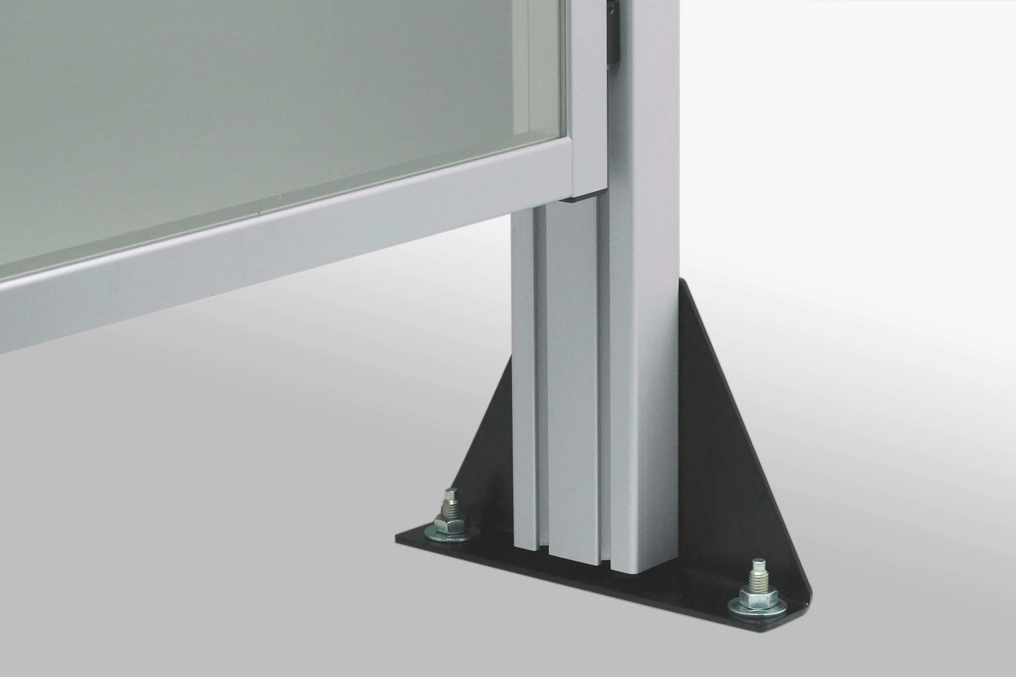 Stand Feet 8 240x160 are a particularly cost-effective and sturdy means of securing the stand profiles of free-standing enclosures and guards to the floor. The Stand Feet are secured to the stand profiles by screwing them to the profile grooves. Line 8 Profiles, preferably with a cross-section of 80x40 mm or larger, are used for the stand profiles. The diameter 18 mm through holes for securing the Stand Feet to the floor can also be accessed after the feet have been installed and enable subsequent drilling of the anchoring holes. To ensure that high loads are directed into the floor, use of Floor-Fastening Sets M12x150 is recommended.
