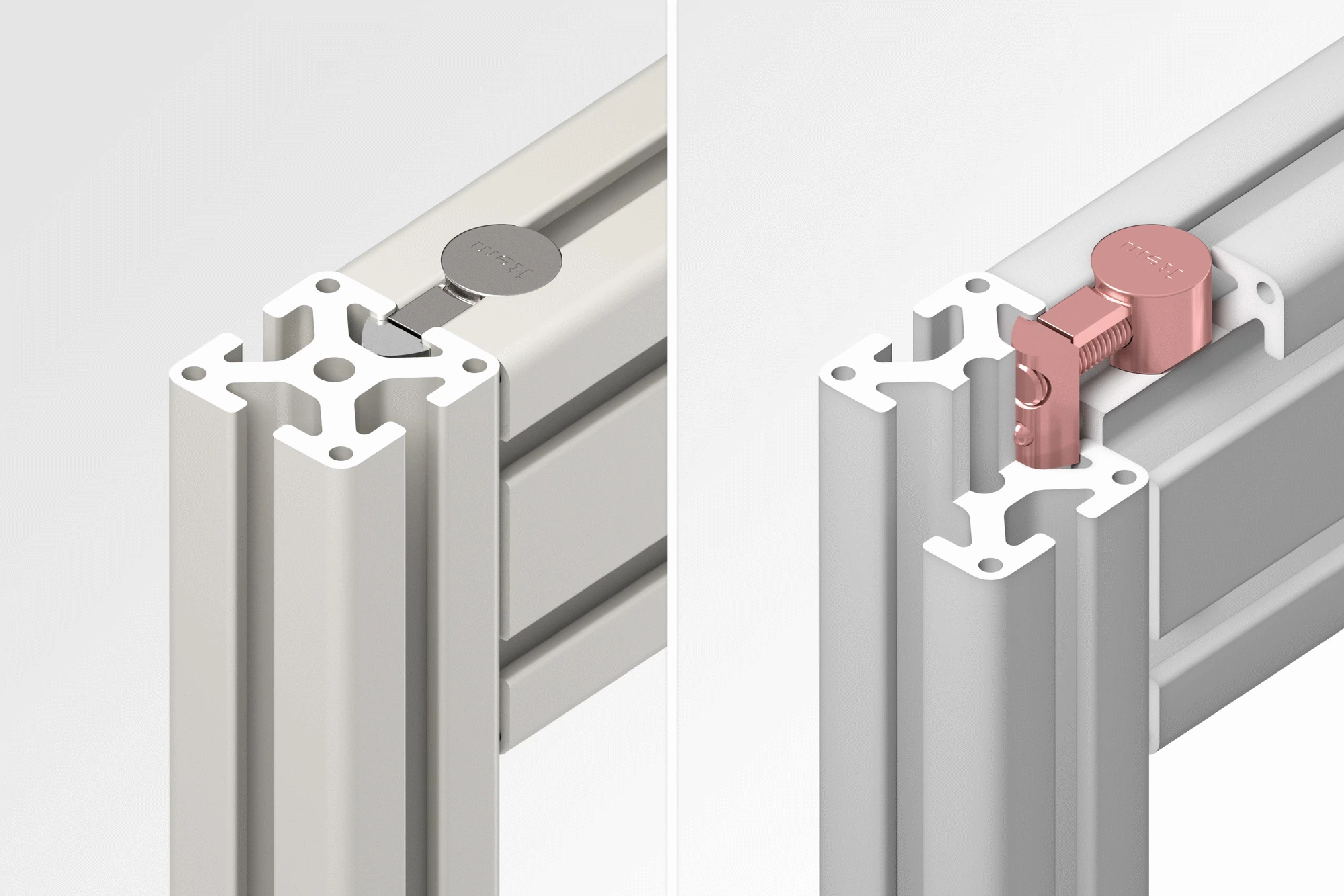 Universal-Fastening Set 10, bright zinc-plated from item joins two Line 10 profiles at a right angle to create a non-rotating connection that is highly resistant to displacement, torsion and bending. The profile can be retrofitted and moved at any time. The Universal Fastener is made of die-cast zinc and requires an installation bore.