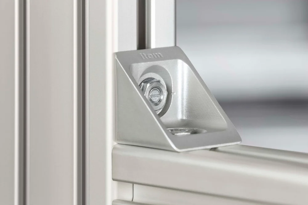 The fastest profile connection ever – automatic angle brackets and automatic flat brackets from item. These innovative fasteners are fully preassembled and ready for use. Simply fit them in place and the screws slot into the correct position. Tighten the screws and that’s it, the profiles are held in place without the need for additional T-Slot Nuts. Automatic Flat Bracket Sets and Automatic Angle Bracket Sets virtually install themselves. No threads need to be tapped and profiles don’t need to be machined. The fasteners can be inserted at any point along a Line 8 groove and can be reused and repositioned whenever required. All you need to do is turn the screws. Automatic Angle Bracket Sets make connections inside the frame contour and Automatic Flat Bracket Sets produce readily accessible connections on the outside of the frame. Unlike other profile fasteners, automatic flat brackets are installed on the profiles and can therefore be used to reinforce connections, since the large support width is extremely effective at compensating for torque loads. Profile connections made with automatic flat and angle bracket sets can also compensate for inaccuracies and errors made when cutting profiles to length. Automatic flat bracket and angle bracket sets are ideal whenever work needs to move fast. They are an ingenious innovation from item that further simplifies assembly work.