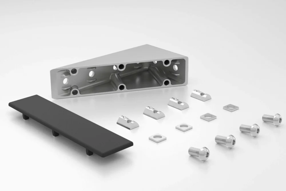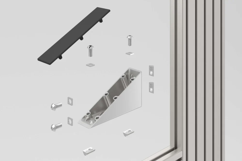Angle Bracket 8 160x80 Zn, die-cast zinc, white aluminium, similar to RAL 9006 Angle Bracket Cap 8 160x80, PA-GF, black 4 Button-Head Screws ISO 7380-M8x18, St, bright zinc-pl. 4 Washers 13.9x13.9x2 St, bright zinc-plated 4 T-Slot Nuts 8 St M8, bright zinc-plated