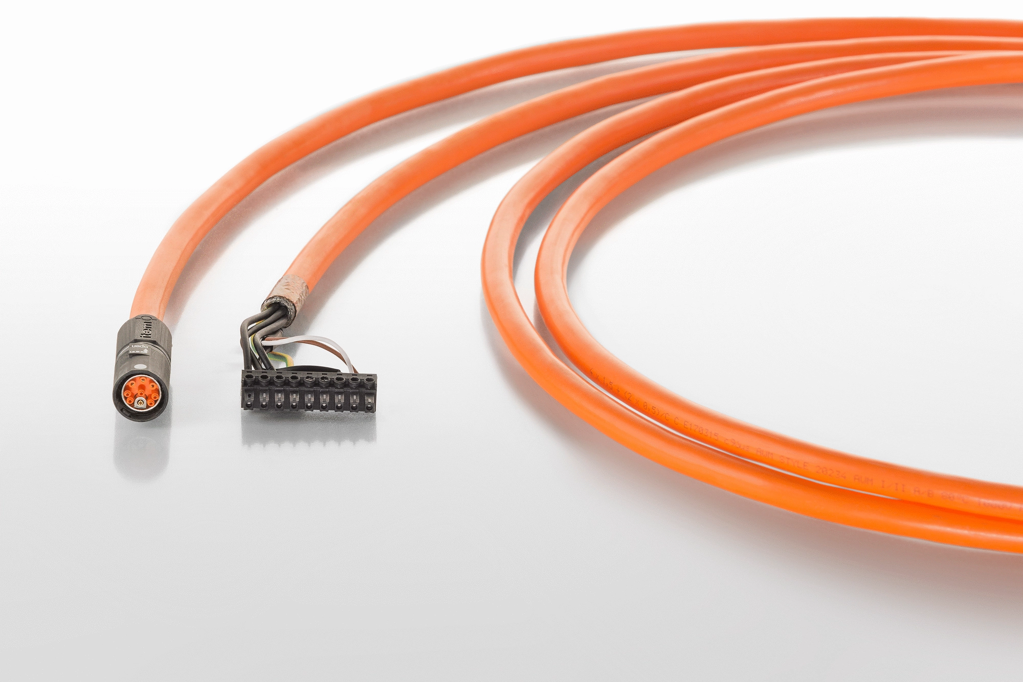 To prevent interference, communication between the Motor and Controller takes place via two separate cables: The orange Power Cable feeds power to the Motor, while the green Data Cable is reserved for data transfer. In addition to colour coding, distinct connectors ensure cables are not connected to the wrong terminals. All cables are available in standard lengths of 5 and 10 metres. Data Cables feature EMC shielding. When selecting Power Cables, it is important to choose the correct type of cable for the load involved. The connectors make the separate types of cable unmistakeable and ensure they are not connected to the wrong terminal. Note: If you use item MotionDesigner ® to configure a turnkey system, the software automatically selects the right Cable.