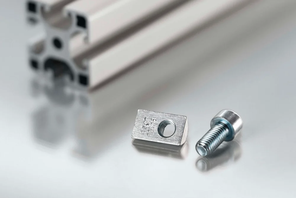 The fastening set enables the connection of elements (e.g. sheets or panel elements) in the specified material thickness. The set consists of a T-Slot Nut and a matching screw.
