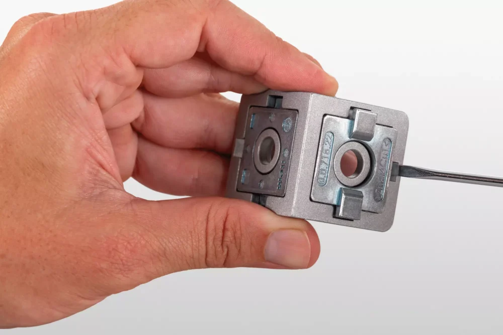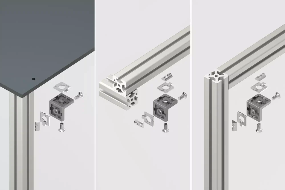 Angle Bracket 2V 8 40 features two inserts with anti-torsion features. It can be used to create right-angled and crossing profile connections with no need for additional machining. This metal bracket can also be used to fasten panel elements to profiles. The inserts can be fitted in 90° increments and reversed. This ensures the anti-torsion features can be positioned to match the alignment of the profile groove. Reversing the insert creates a flat surface.