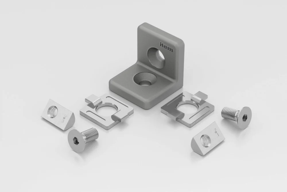 1 Angle Bracket, die-cast Al, natural 2 inserts, die-cast zinc, bright zinc-plated 2 T-Slot Nuts 8 St M8, St, bright zinc-plated 2 Countersunk Screws DIN 7991 M8x18, St, bright zinc-plated