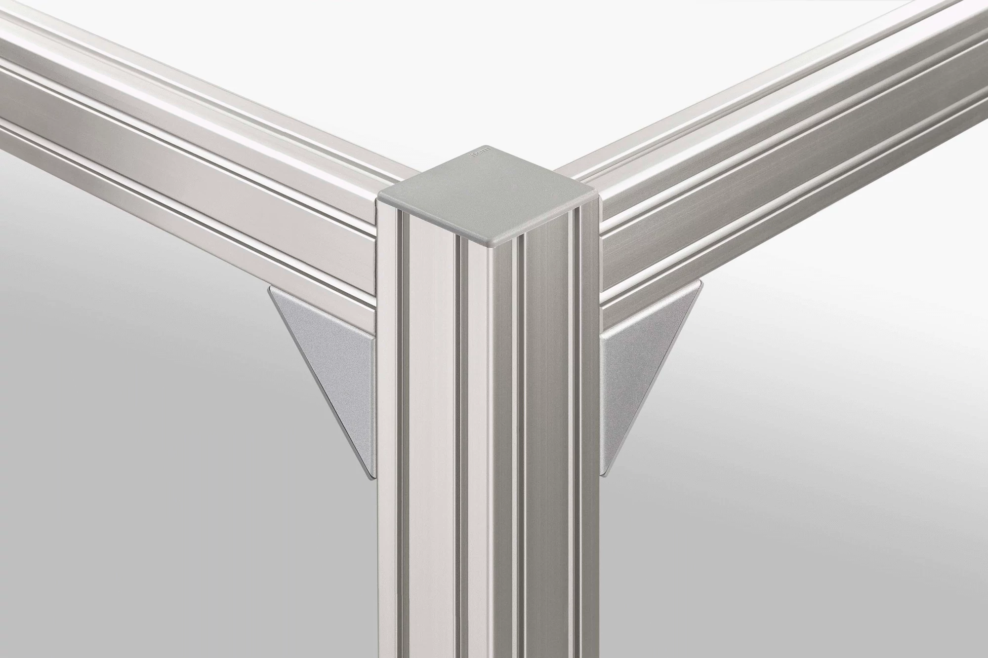 Angle Bracket 8 80×80, die-cast zinc, white aluminium, similar to RAL 9006 Angle Bracket Cap 8 80×80, PA-GF, grey, similar to RAL 7042 4 Button-Head Screws ISO 7380-M8x18, St, bright zinc-pl. 4 Washers 13.9×13.9×2 St, bright zinc-plated 4 T-Slot Nuts 8 St M8, bright zinc-plated