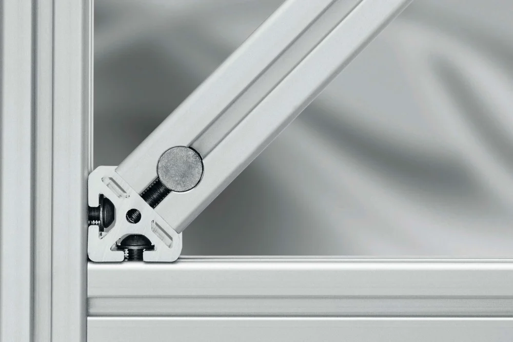 Connection elements for fastening a profile at an angle of 45° when working with bracing and latticework. Where required, the anti-torsion pin of the Universal Fastener can be broken off at a specified breakpoint. This Universal-Fastening Set can thus also be used to secure profiles to e.g. panels.