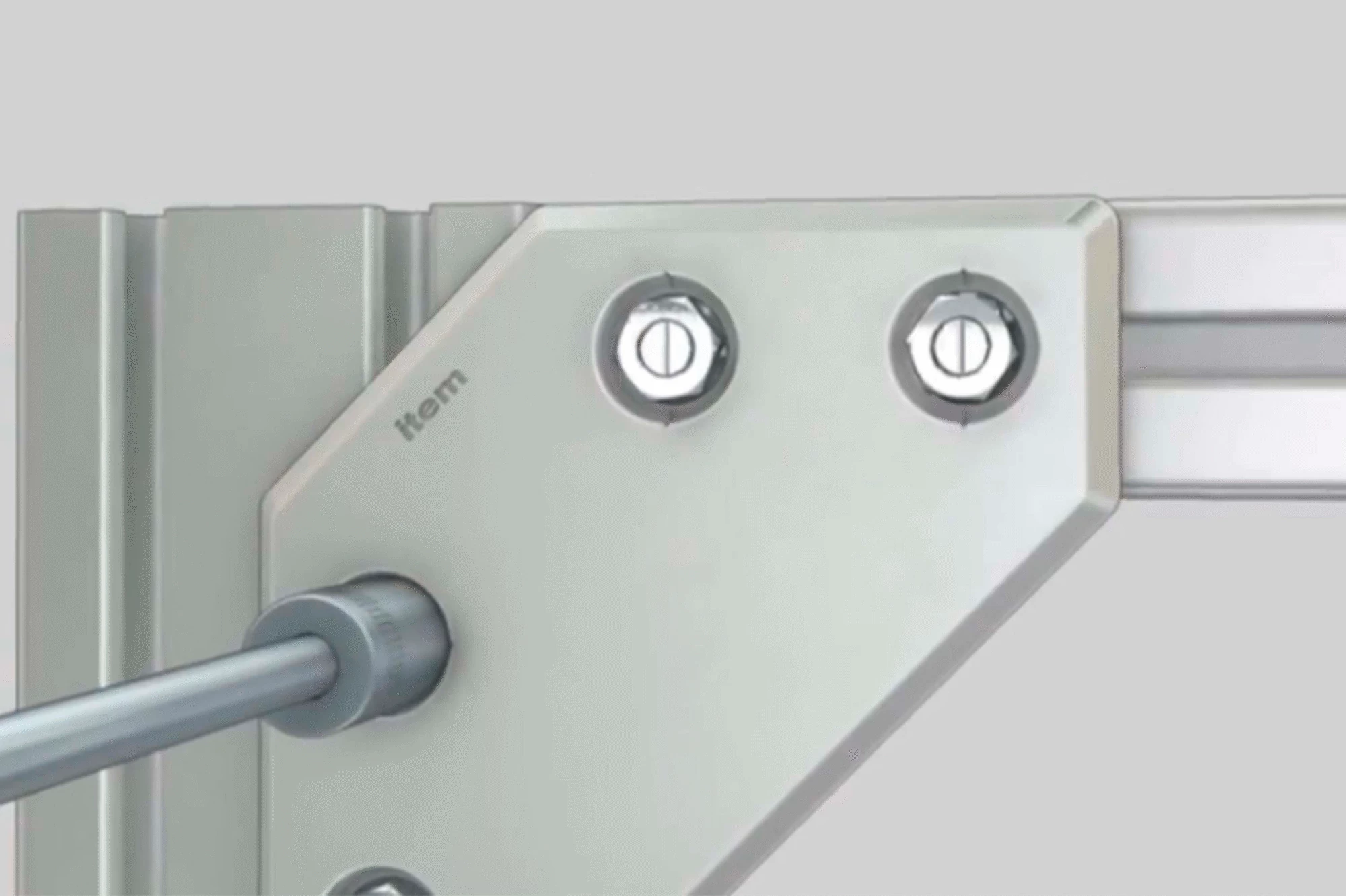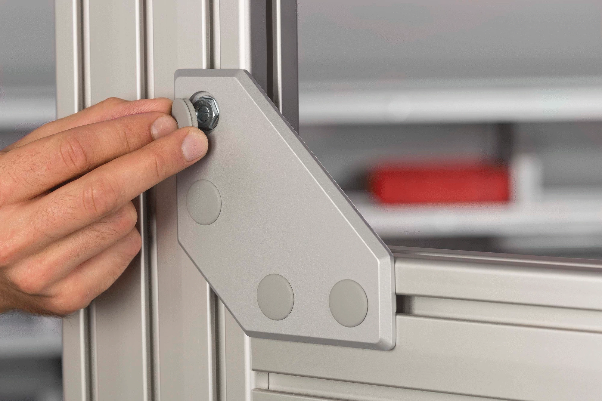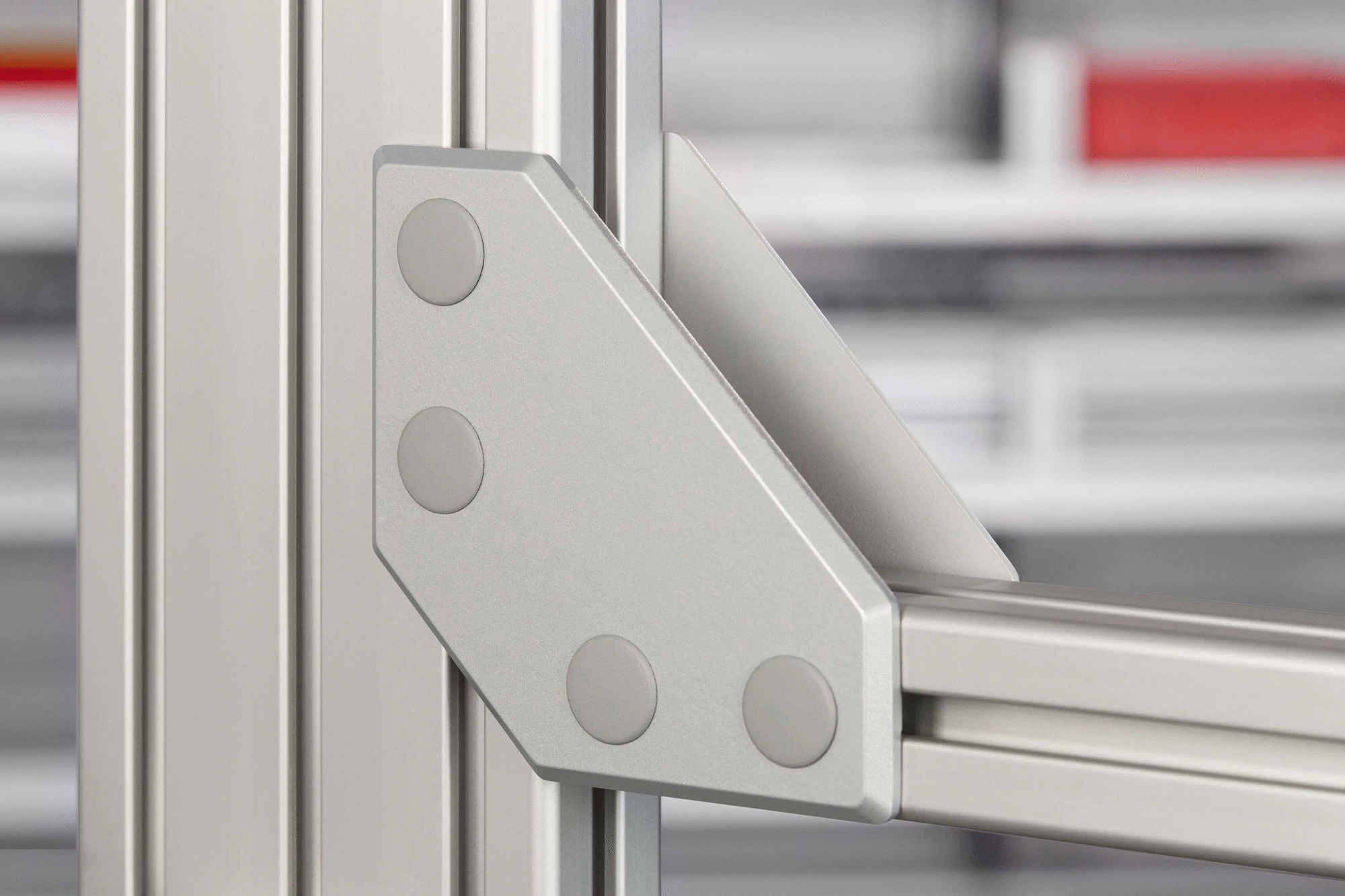 Automatic flat bracket 8 120×120, die-cast Al, white aluminium similar to RAL 9006 4 automatic T-slot screws M8x11, St, bright zinc-plated 4 countersunk nuts M8x6, St, bright zinc-plated 4 Caps 8 D20, PA-GF, grey similar to RAL 7042