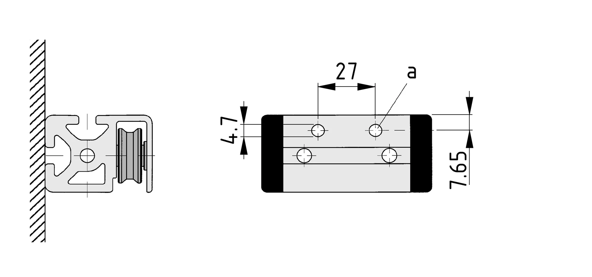 If there are undefined loads on the guide unit such as impact loads that could cause movement in the Bearing Units, the Bearing Units will need to be reinforced. You can do this by drilling and pinning (a) the Units in the positions indicated or the areas shown in dark grey. a = dowel DIN 7979-5x16