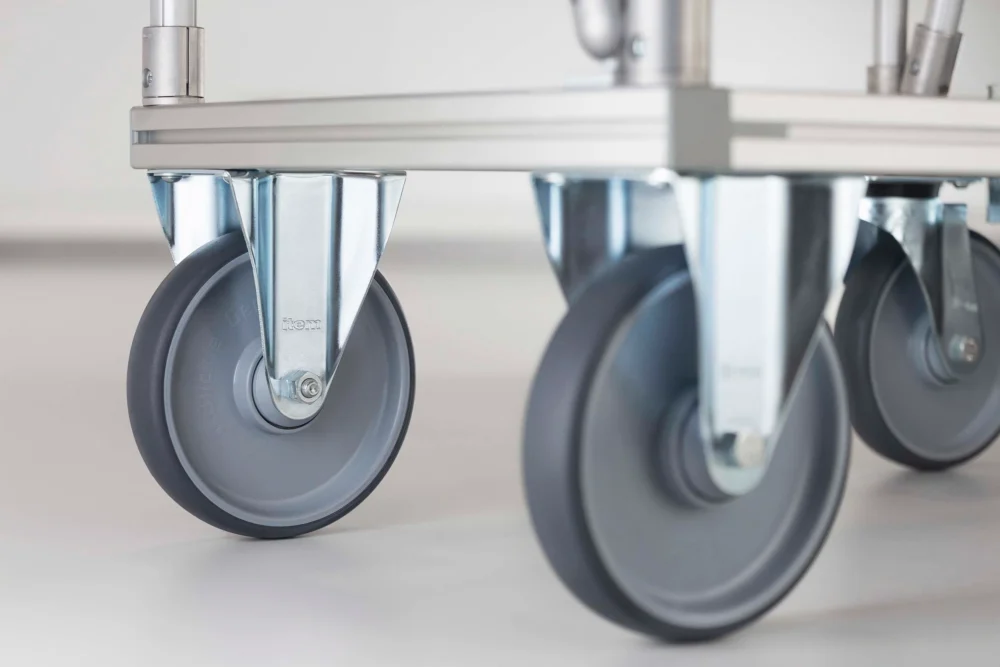 It’s time to set the wheels in motion! Building transport trolleys with high load-carrying capacities is now easier than ever when using Swivel and Fixed Castors from item. The new models satisfy the high requirements in industry and skilled trades. The robust Castors, available in diameters D100, D125, D160 and D200, are easy-running and ideally suited to typical transport tasks. Each can be supplied as a Swivel Castor, Swivel Castor with double-brake or a Fixed Castor – and each in a standard and an ESD-safe design. Stable ball bearings and wheel bodies made of polyamide 6 ensure the Castors provide a long service life. The tyre of the wheels consists of high-grade, abrasion-resistant polyurethane. The integrated Adapter Plate with four holes provides a stable fixing. Operating forces are reliably transmitted to the frame. Fastening Set 8 for Castor swivel/fixed 140x110 is to be used for installation purposes. The Swivel Castor with double-brake uses a foot-operated catch to lock the wheel in a specific position and direction so that it cannot move. If a trolley with four Swivel Castors is to be used in a train with other trolleys, the swivelling action of the castors on one axis must be locked. The optional Swivel Lock is used for this purpose and can also be retrofitted. The high quality standard is unmistakeable. Note : The 100 percent dissipative capacity of the antistatic Castors is ensured up to 65 percent of the maximum load. If loads on the Castors exceed this level, the ability of the Castors to dissipate electrostatic charges can be impaired. As a preventive measure, it is advisable to choose a larger castor diameter with a higher load-carrying capacity.