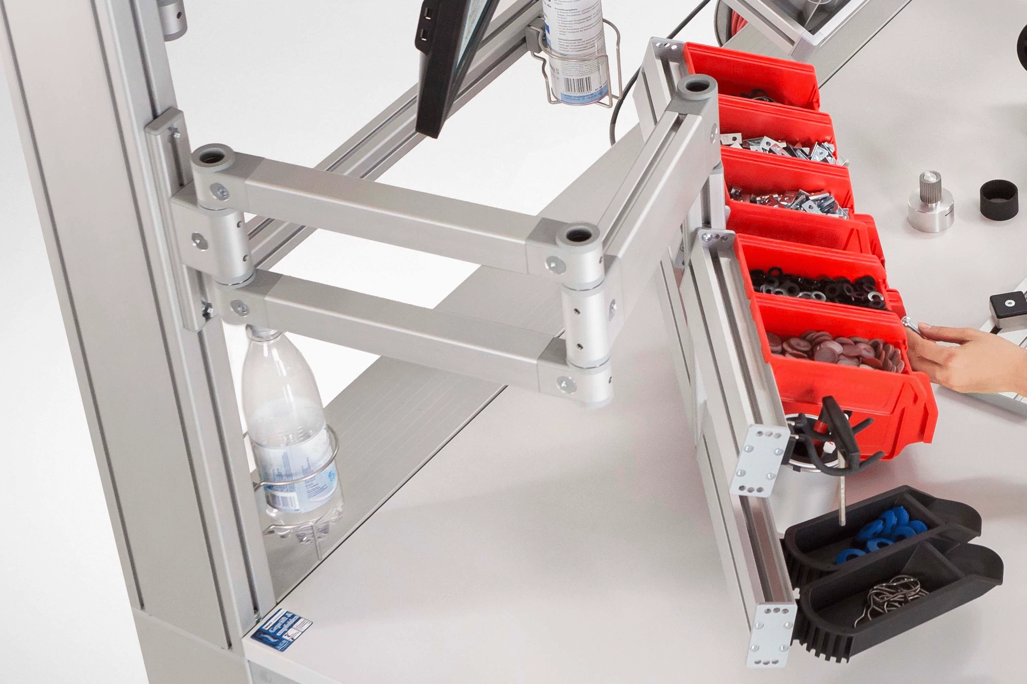 Employees who often work with screws, nuts and other small parts will find the item Container Pivot Arm the perfect solution. Parts Containers and semi-open fronted boxes from various manufacturers can be securely hung on the arm’s four support profiles. Friction-adjustable joints and the tilting function on the four support profiles ensures that containers can be perfectly positioned to suit the operator’s reach. Thanks to the three joint axles, the Pivot Arm can be positioned at the ideal distance from the user and at the perfect angle. The four support profiles of the Container Pivot Arm are height adjustable for compatibility with a range of container sizes. Note: All the components needed to design custom material supply solutions can be found in the section on Pivot Arms.