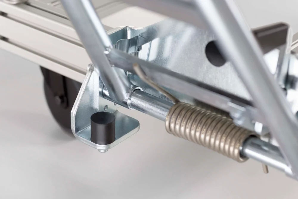 Beim Herunterklappen sorgt der optionale Deichsel-Anschlag 32 dafür, dass der Bügel nicht auf den Boden fällt bzw. mit dem Fuß zu tief gedrückt werden kann. Ein elastischer Puffer fängt die Deichsel rechtzeitig ab.