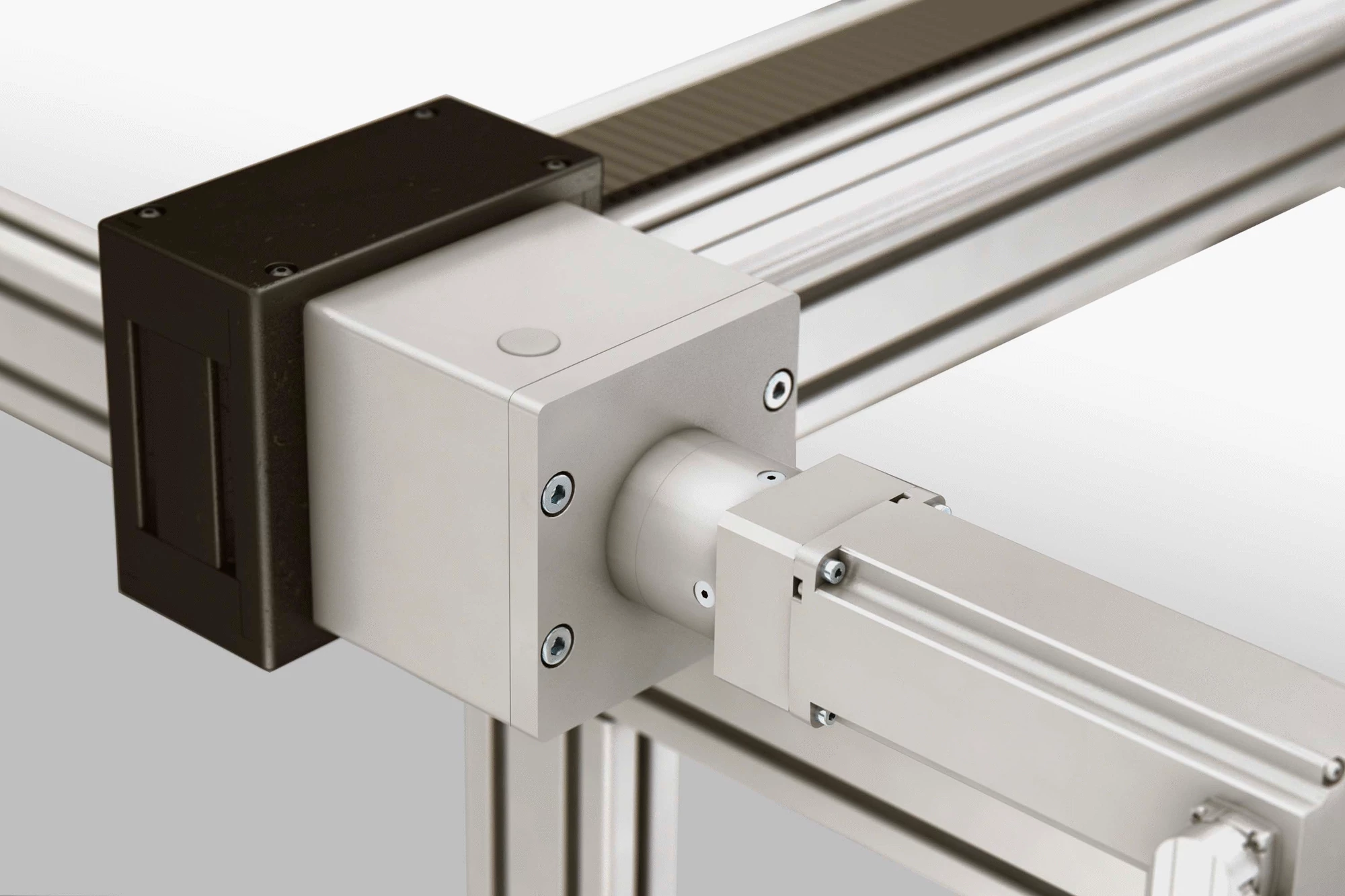 Drive Sets LRE from item connect the compact Linear Units LRE with a drive of the customer’s choosing. This is made possible by an Adapter Plate that can be machined to suit any requirements. The central coupling bore can also be enlarged to match the drive shaft. Thanks to the integrated expanding hub coupling, the casing is particularly narrow. The Drive Set can be fitted to either side of the Timing-Belt Reverse Unit. Compatible Synchronising Sets from item can be used to operate two Linear Units in parallel with just one motor.