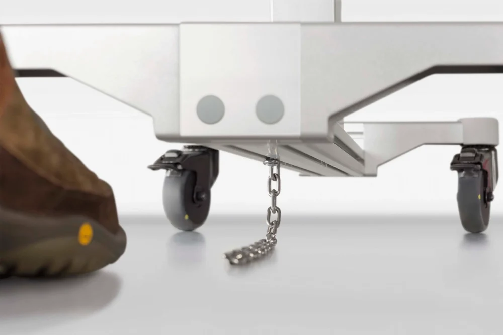 The best protection under all conditions: The stainless steel ESD Drag Chain dissipates electrostatic charges on item SystemMobiles and mobile racks, for example, by maintaining permanent contact with the ESD-safe floor. The Drag Chain cleans itself while on the move, so that it can be relied on to do its job even in dusty working environments. This eliminates the high level of maintenance work that has to be carried out when relying solely on electrostatically dissipative castors, which require regular cleaning. The ESD Drag Chain is compatible with Line 6 and 8 profiles.