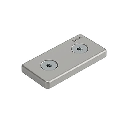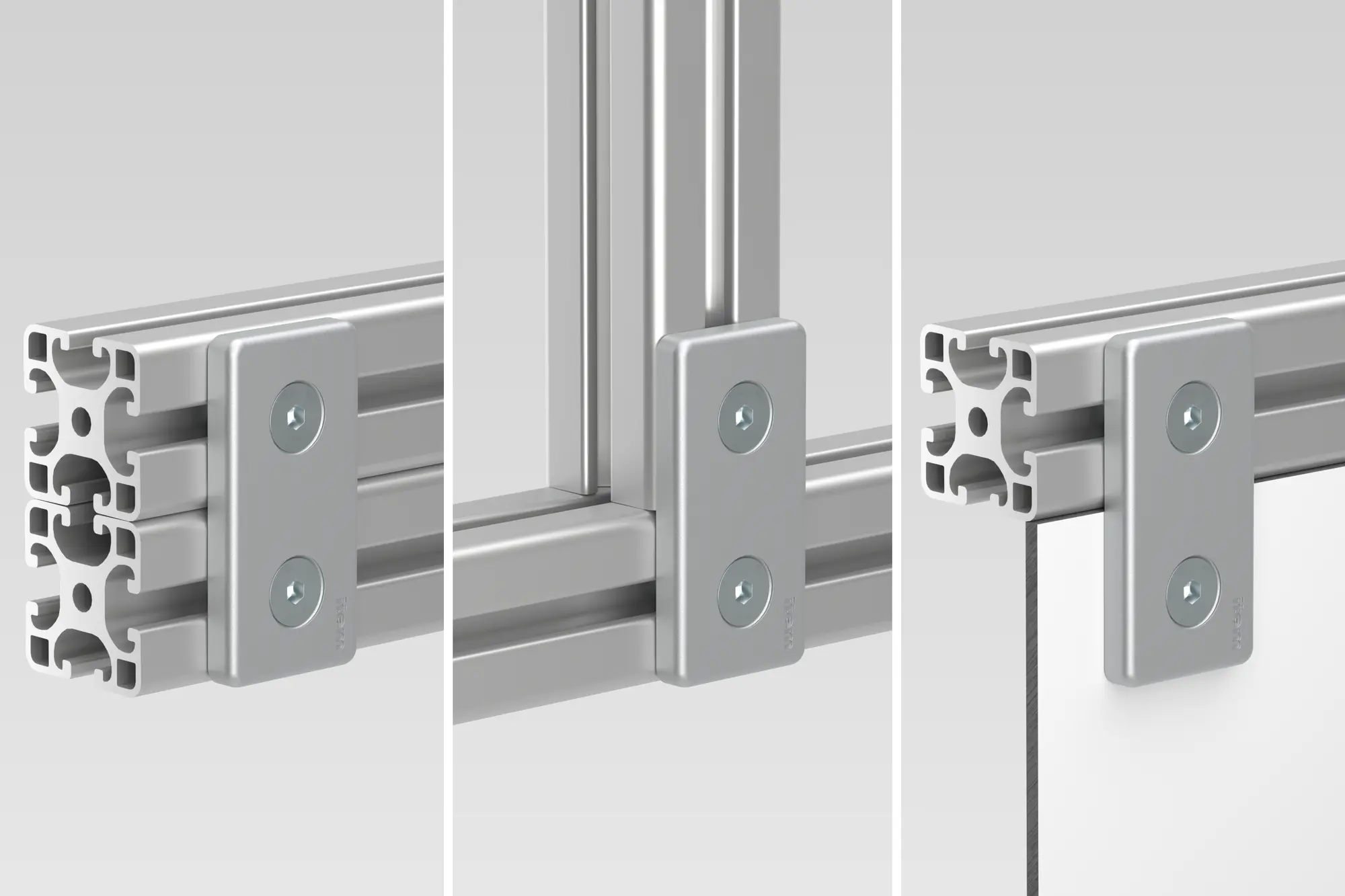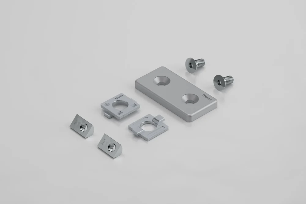 1 flat bracket 80×40, die-cast Al, natural 2 inserts, die-cast zinc, bright zinc-plated 2 T-Slot Nuts 8 St M8, St, bright zinc-plated 2 Countersunk Screws DIN 7991 M8x18, St, bright zinc-plated
