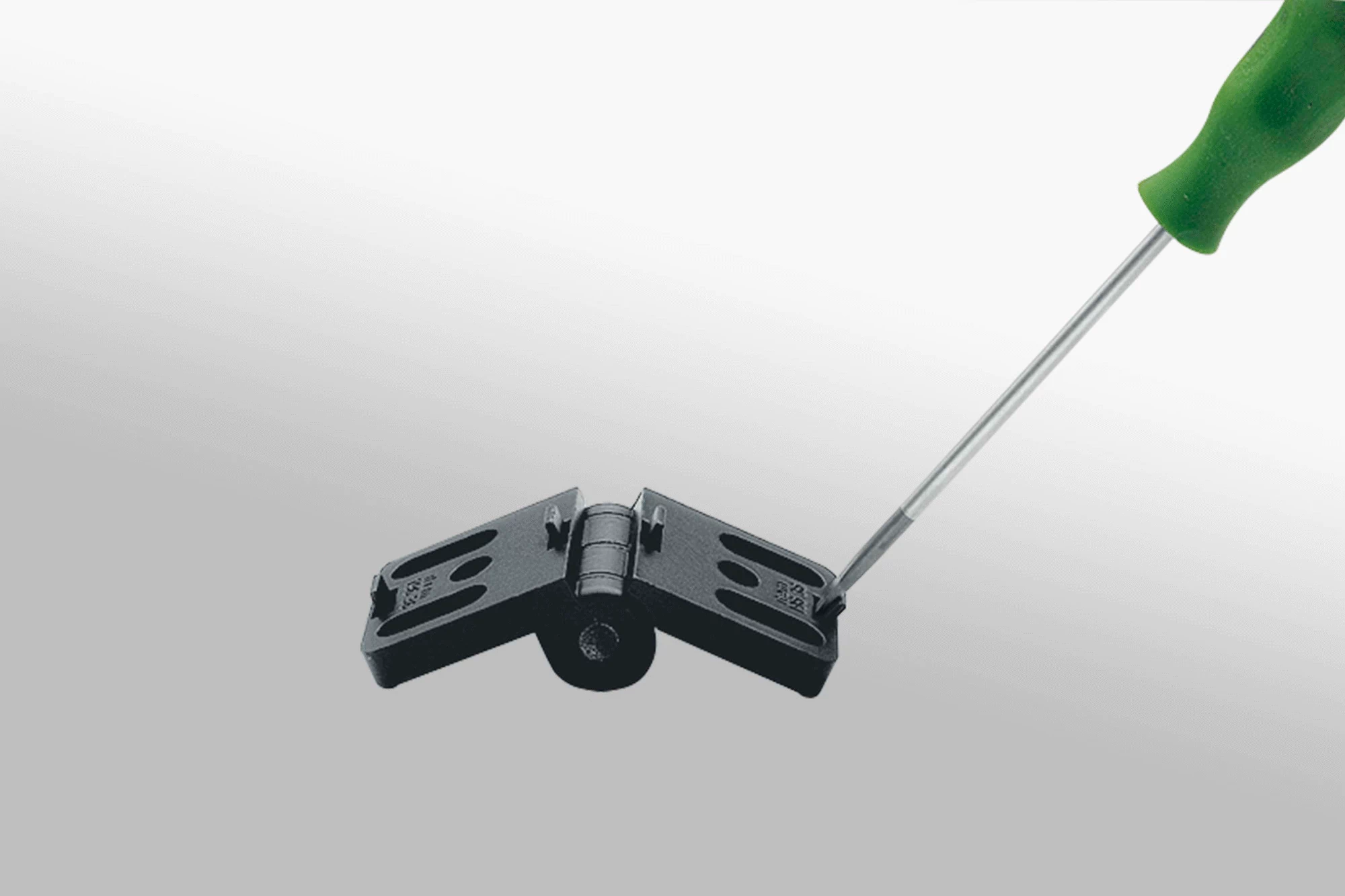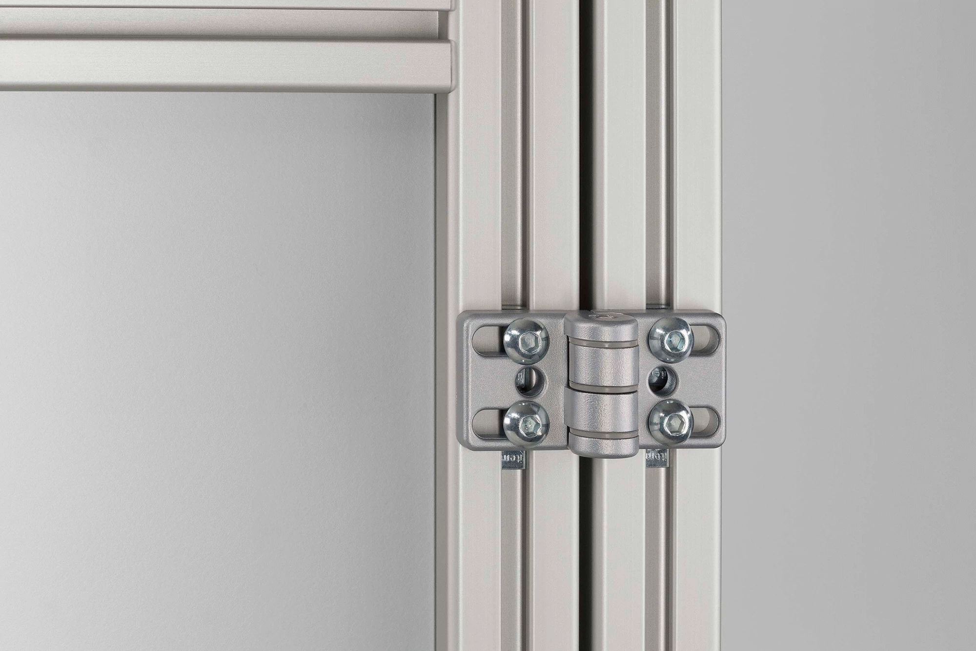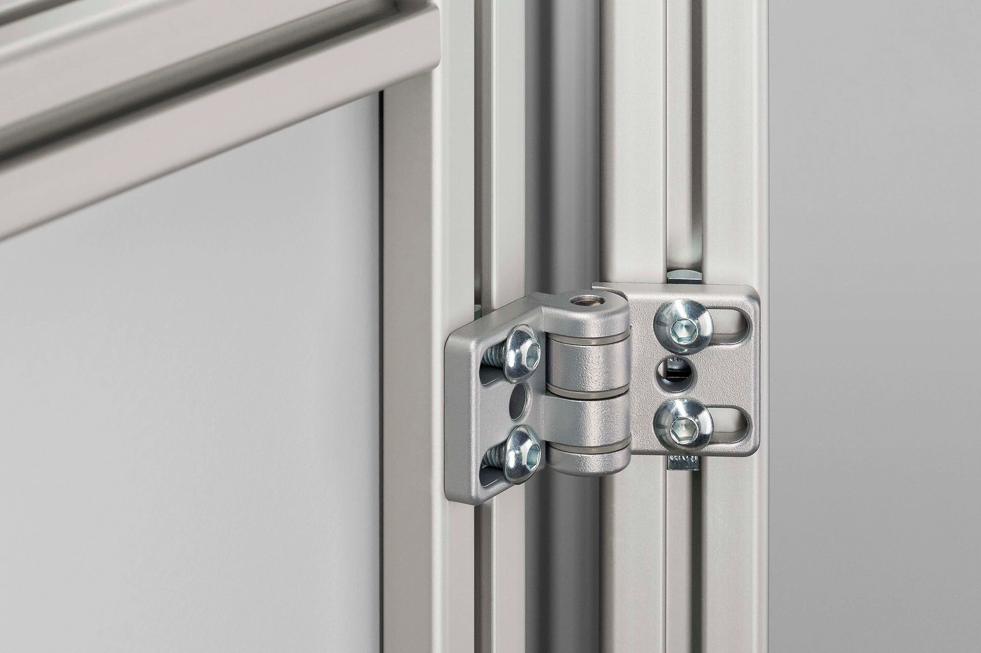 Holds heavy doors, too! Hinge 8 40 Zn in white aluminium is designed for high loads. It holds large doors on machines, guards and enclosures securely in place for the long term. The white aluminium design blends perfectly into the overall look of machinery. Hinge 8 40 Zn is also available in black (0.0.196.36). Hinges Zn connect together profiles at any angle up to 180°. They can be used on the left or right and can be attached to the outer surfaces or end faces of profiles.
