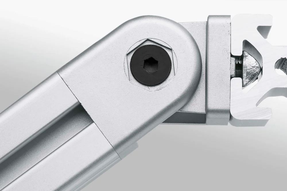 2 hinge halves, die-cast zinc, RAL9006 white aluminium 4 fixing elements, die-cast zinc, bright zinc-plated 2 thread bushes M8, St, zinc-plated 2 spacer rings, St, stainless 2 Countersunk Screws DIN 7991-M8x10, St