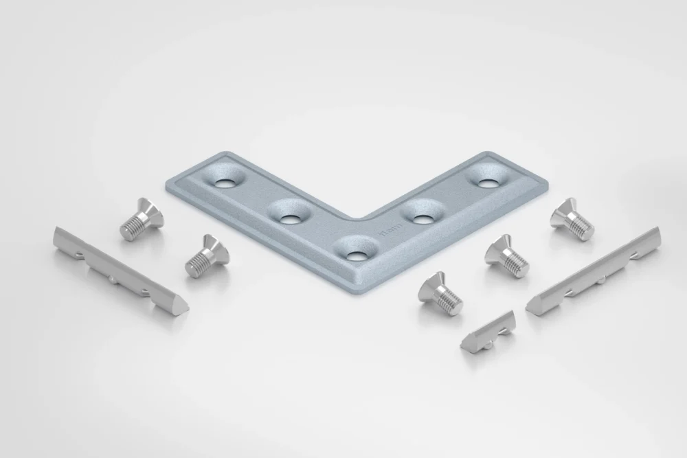 1 Joining Plate, St, bright zinc-plated 5 Countersunk Screws DIN 7991 M8x16, St, bright zinc-plated 2 T-Slot Nuts V 8 St 2xM8-73, St, bright zinc-plated 1 T-Slot Nut V 8 St M8, St, bright zinc-plated