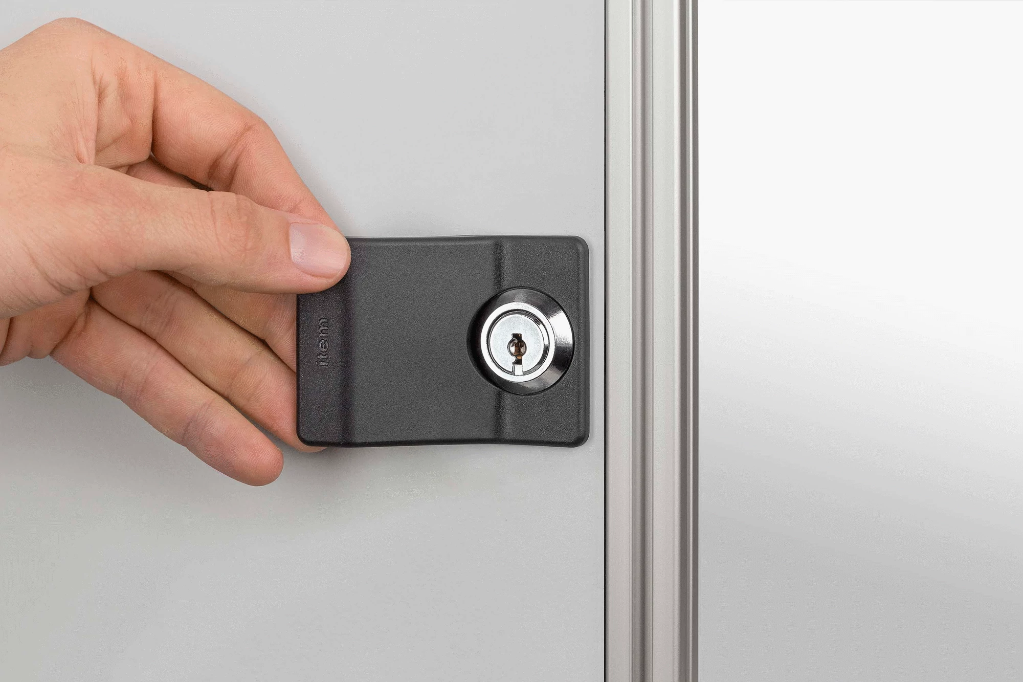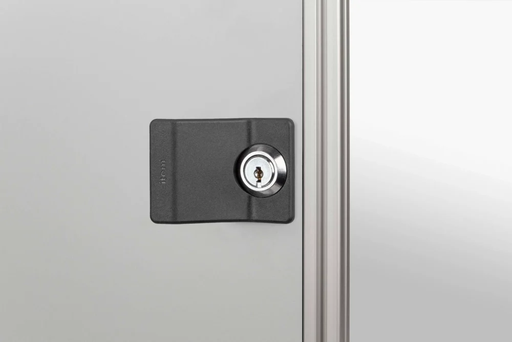 The proven locking systems for Lines 5, 6 and 8 are now available in a new form. In the variant with escutcheon, the panel element has an anti-torsion feature for the locking system and the locking system itself is covered over to provide an attractive finish. In the variant with integrated grip, the escutcheon also serves as an ergonomic grip. There is no need for an additional grip/handle on the door. Locking Systems with escutcheons/grips are fitted directly into the frameless panel element (thickness 1-8 mm) and lock the door in the profile groove that holds the nab. Use of an additional Door Rabbet or stop is recommended. All variants of Locking Systems with escutcheons/grips are available for both left-hand and right-hand application (the right-hand option swings the locking bar in clockwise direction into a groove on the right of the door; the situation is reversed for the left-hand option). In addition to Cylinder Locks with keys identical, variants are also available with Double-Beard Locks.