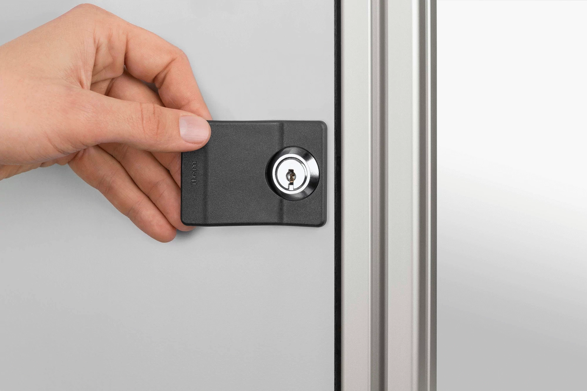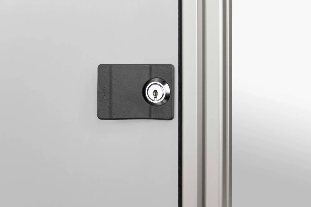 The proven locking systems for Lines 5, 6 and 8 are now available in a new form. In the variant with escutcheon, the panel element has an anti-torsion feature for the locking system and the locking system itself is covered over to provide an attractive finish. In the variant with integrated grip, the escutcheon also serves as an ergonomic grip. There is no need for an additional grip/handle on the door. Locking Systems with escutcheons/grips are fitted directly into the frameless panel element (thickness 1-8 mm) and lock the door in the profile groove that holds the nab. Use of an additional Door Rabbet or stop is recommended. All variants of Locking Systems with escutcheons/grips are available for both left-hand and right-hand application (the right-hand option swings the locking bar in clockwise direction into a groove on the right of the door; the situation is reversed for the left-hand option). In addition to Cylinder Locks with keys identical, variants are also available with Double-Beard Locks.