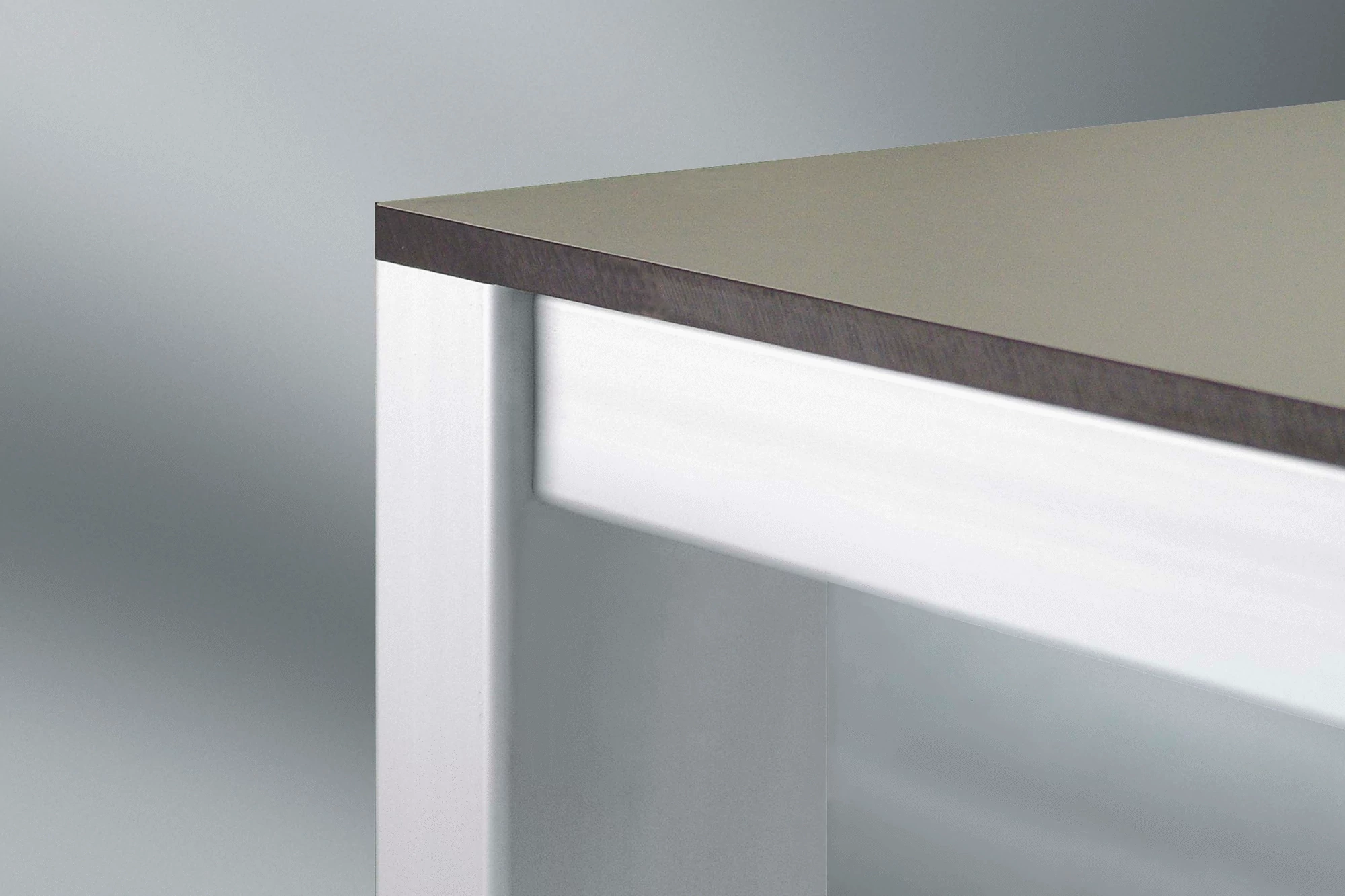 Profiles 8 40x32 and 80x32 light are particularly suitable for use as frames and struts in table, shelving and cabinet constructions. They are then used to connect profiles of modular dimension 40 mm. When used in conjunction with profiles with modular dimensions, this results in a recess of 8 mm. This enables e.g. a panel element (up to 8 mm thick) to be run over and alongside 32 mm wide profiles in one continuous length. The profile on the inside can be used as a high-strength support (e.g. for a shelf) and reinforces the entire construction.