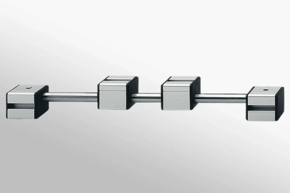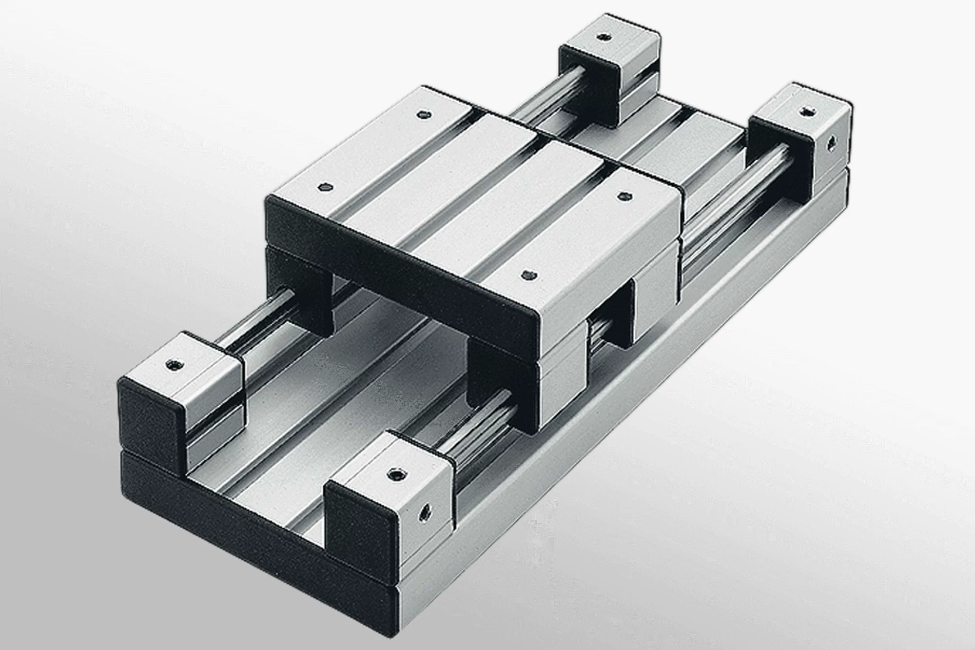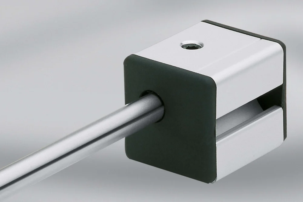 The application and characteristics of the modular ball-bush block guides are similar to those of the ball-bearing guide bushes. By separating the sliding carriage into two units, the distance between the points of support on the guides can be selected in accordance with the applied loads. The special profiles of sizes 40x40 and 60x60 (with Line 8 grooves) accommodate both the shaft and the Ball Bushes. The range of sizes and the different shaft diameters are designed to withstand applied loads ranging from 500 to 1500 N at a maximum travelling speed of 2 m/s. The Ball Bushes, which are sealed at both ends, and the high-quality grease filling ensure a long service life, even under difficult operating conditions. It is advisable to carry out calculations to check the load-bearing capacity and service life and to make an allowance for the deflection of the guiding shafts in the case of longer strokes. The Direct-Fastening Set is particularly suitable for connecting the profiles of the ball-bush block guides to other profiles, so that the profiles can be moved and no machining is required.