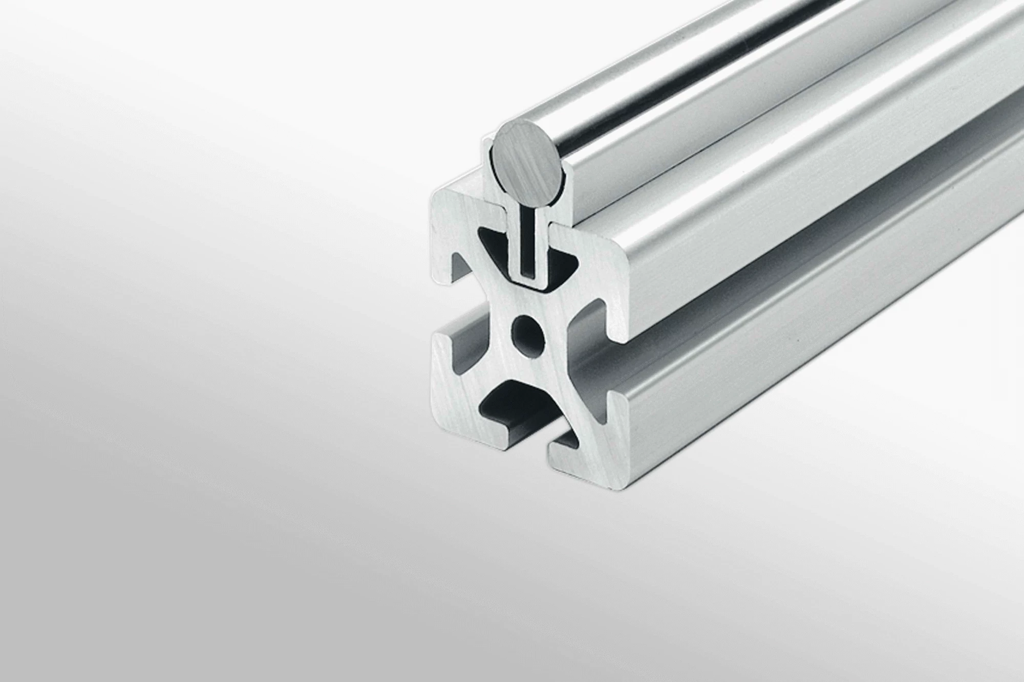 Shaft-Clamp Profile 8 D6 is used for securing Shaft D6 to the groove of a Line 8 Profile. After pressing the Shaft-Clamp Profile into the profile groove, the Shaft is then pressed in. Shafts D6 must be fixed in position at the chosen location using a dowel DIN 6325, one per length of shaft. Shaft-Clamp Profiles must not be used on profile grooves of types "light" and "E", because sufficient clamping will not be achieved.