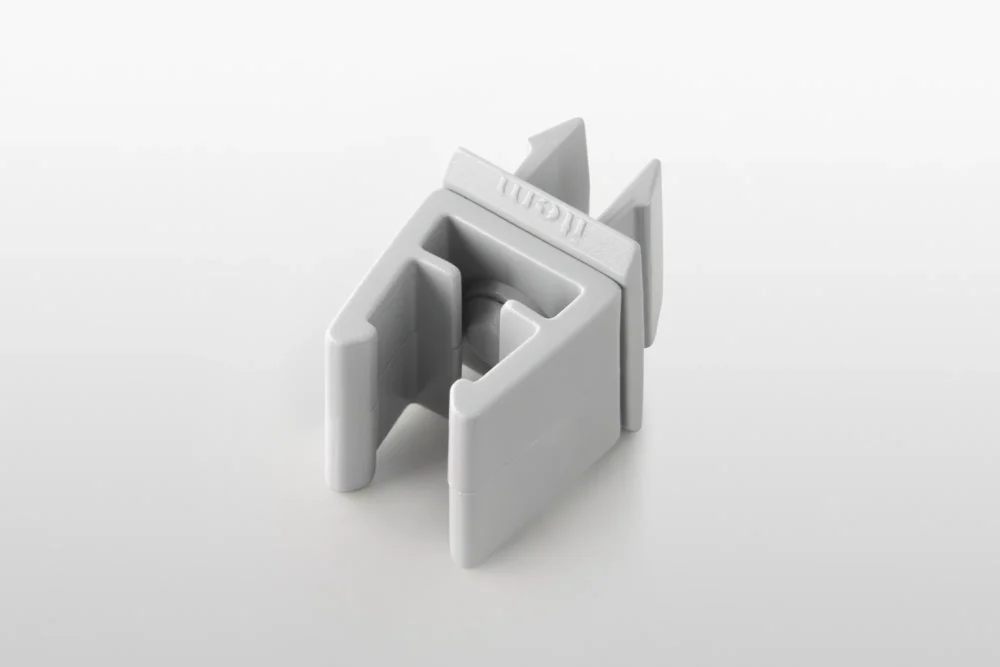 Sign Frame Holder 8, rotating fastens item Sign Frames to or between Line 8 profiles. It clips to any point on a Sign Frame and its rotating head ensures signs can be fastened to two profiles at the appropriate angle. The Sign Frame Holder is compatible with all sizes of item Sign Frames and should always be used in pairs. Sign Frame Holder 8, rotating ESD offers the same functionality, but in a design that is ESD safe.