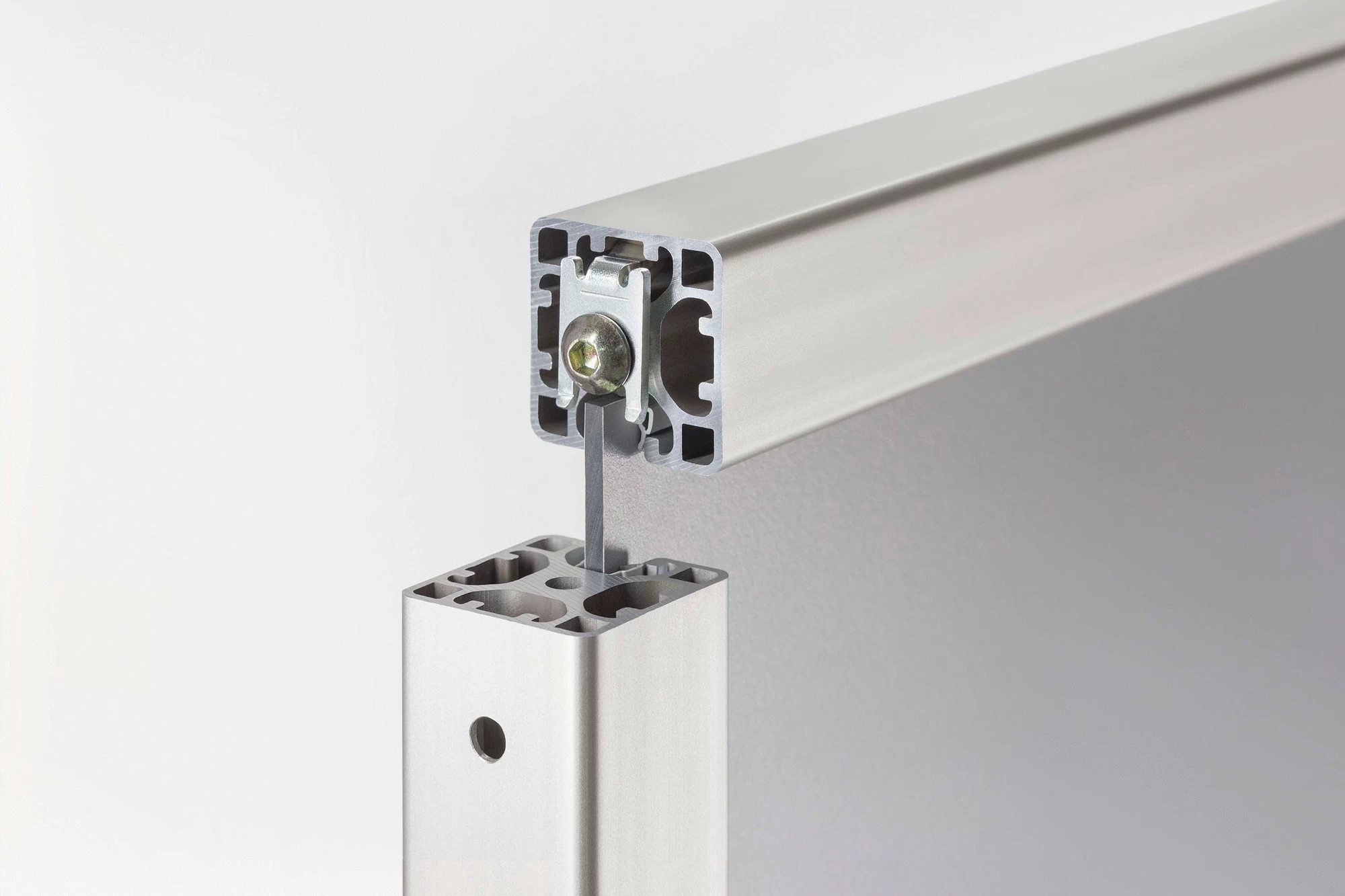 Thanks to the asymmetrical anti-torsion feature on Standard-Fastening Set 8, one-sided, one groove is left free. This means profile frames can be built with one groove that is completely free to accommodate panel elements. The modified connecting plate also allows for profiles to be offset so they can be connected in such a way that they have a flush fit when finished with caps.