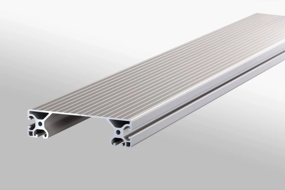 Step Profile 8 160 The narrow Step Profile 8 160 with a ridged surface provides a secure footing. It exhibits no discernible profile deflection, even when used to build wide steps. All the screws and nuts in Step Profile Bracket Set 8 160 are covered and hidden from users’ view. The tread surface of Step Profile 8 160 is perfect for stepladders with a 60° pitch. On stairways with a 30° or 38° pitch, two Step Profiles are connected together to form one deep tread and installed together using Step Profile Bracket Set 8 320. The two 5 mm-wide fastening brackets on a step must be taken into account when calculating the overall width. Step Profiles 8 160 can also be used in lengths of up to 6000 mm to build platforms. When used on platforms, they are laid out as panels in Frame Profile 8 120x40 light, meaning that no additional brackets need to be taken into account.
