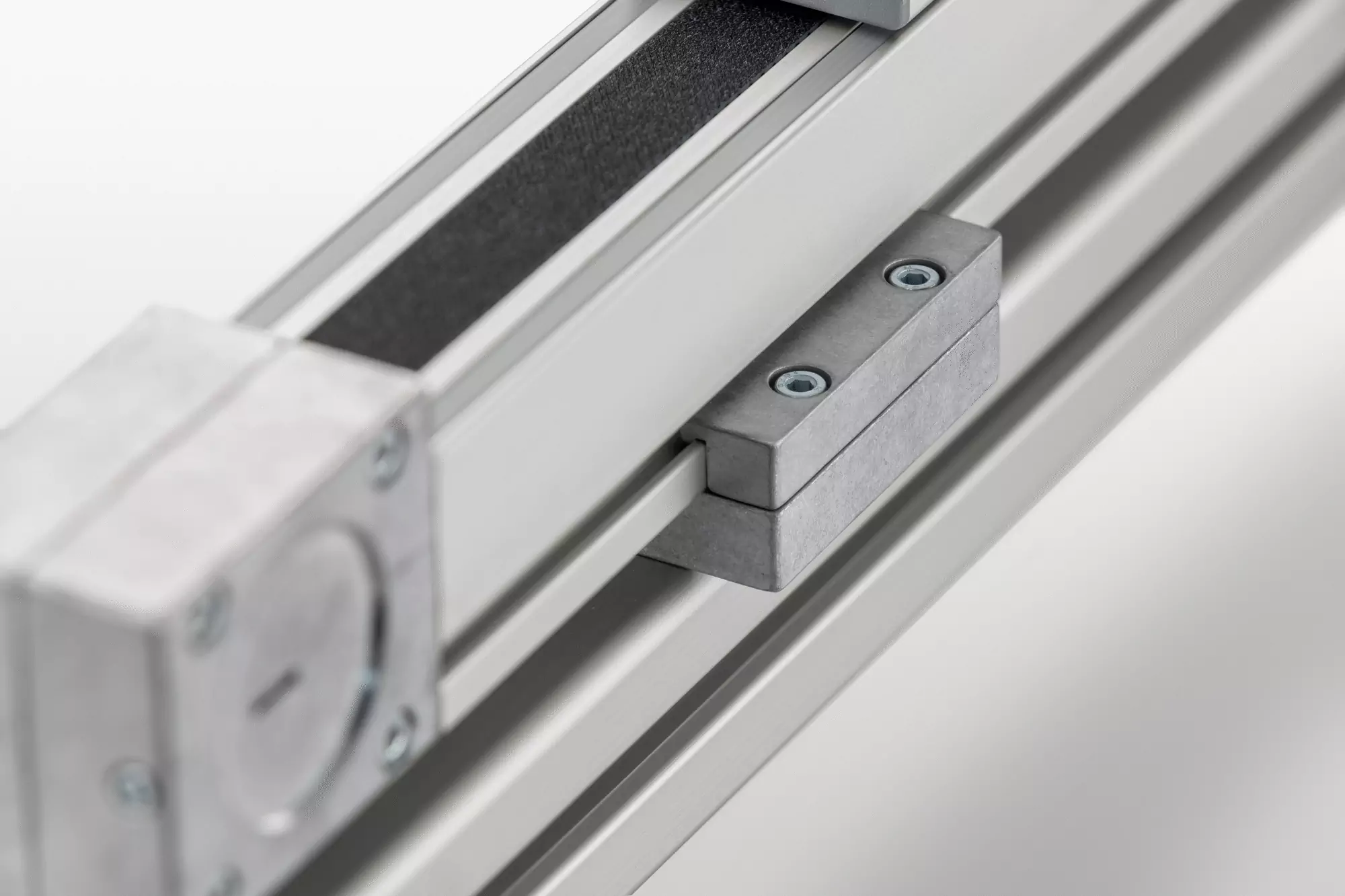 Profile Fastening Set 5 5/8 60x60 enables a friction-based connection between a Linear Unit KLE 5 40x40 LR (0.0.710.86) and profiles with a Line 5 or Line 8 groove. The fastening set is first secured to the groove. Next, the clamping jaws at the sides are loosened, the linear unit is slotted in and the screws are tightened again.