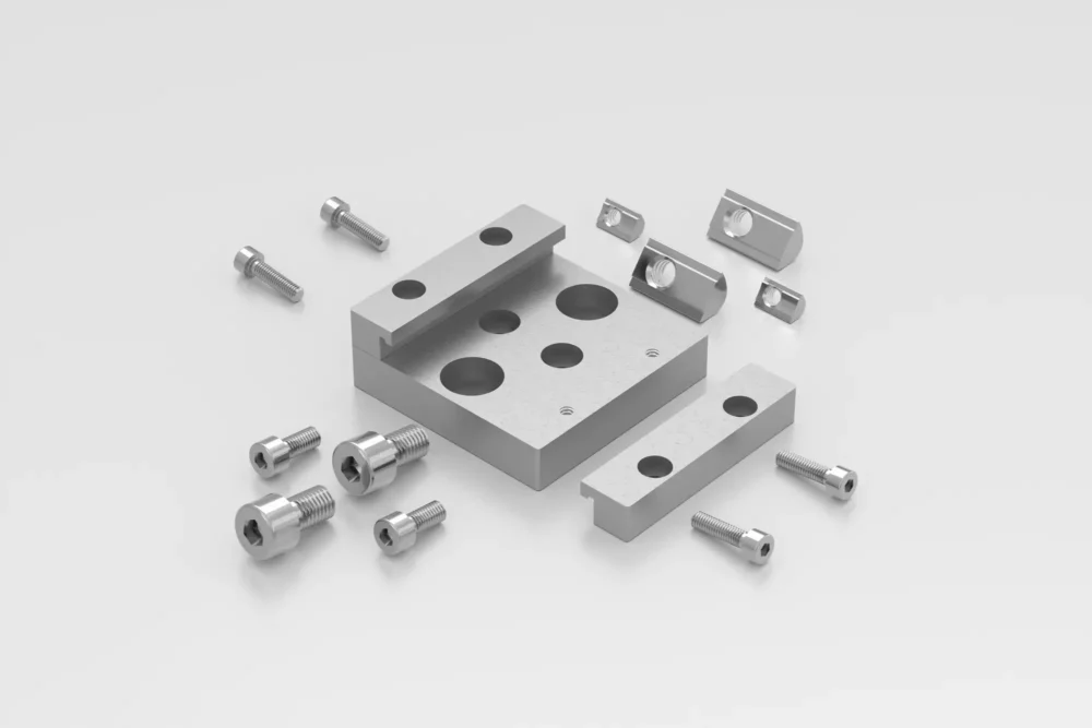 1 adapter plate, Al 2 clamping pieces 2 T-Slot Nuts V 8 St M8, St, bright zinc-plated 2 T-Slot Nuts 5 St M5, St, bright zinc-plated 4 Hexagon Socket Head Cap Screws DIN 912 M4x16, St, bright zinc-plated 2 Hexagon Socket Head Cap Screws DIN 912 M8x14, St, bright zinc-plated 2 Hexagon Socket Head Cap Screws DIN 912 M5x12, St, bright zinc-plated